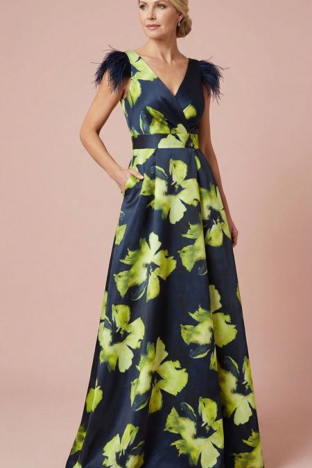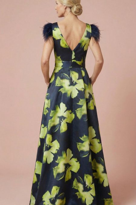 Vestido Largo Oliva Marino con Plumas