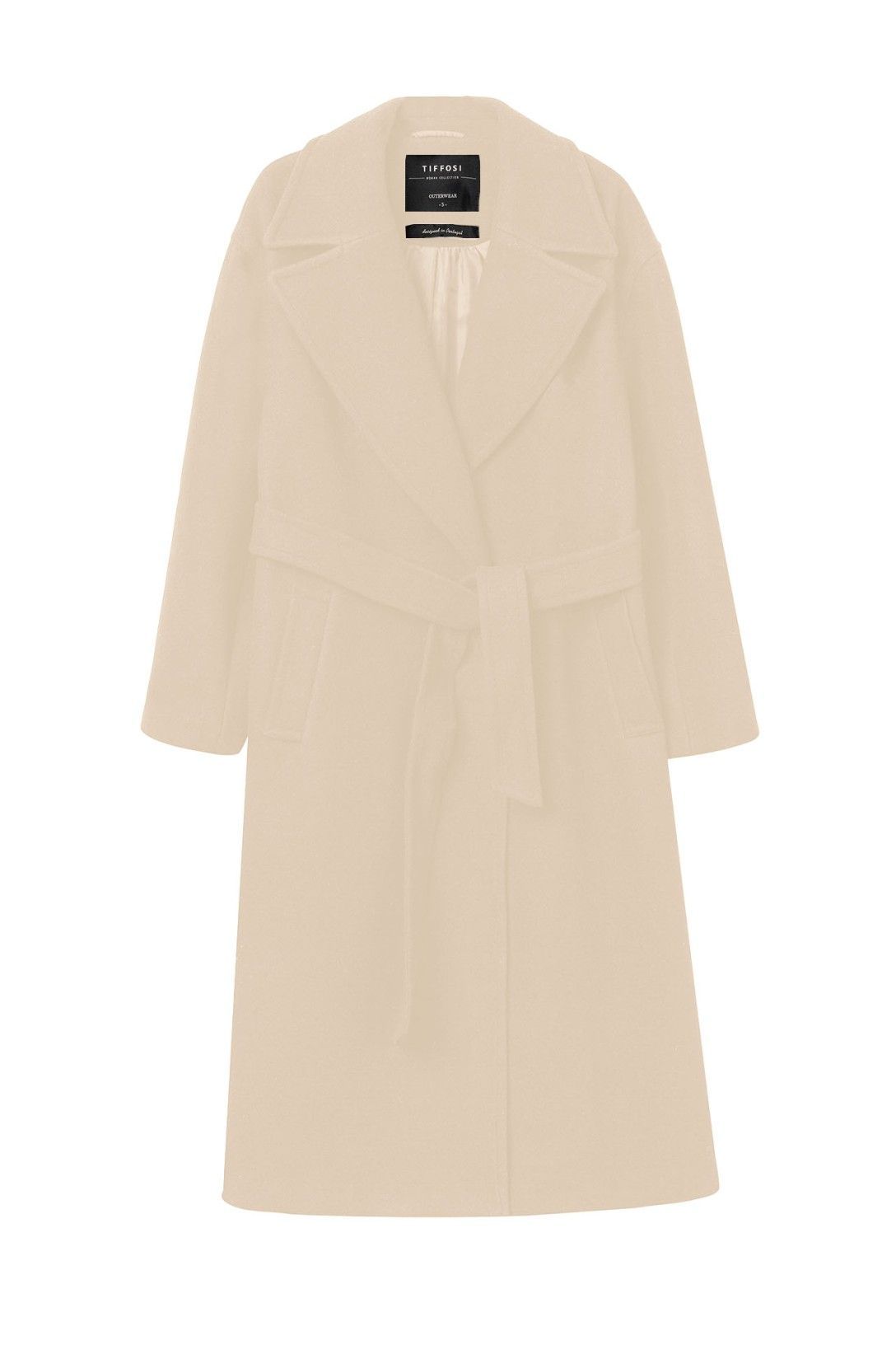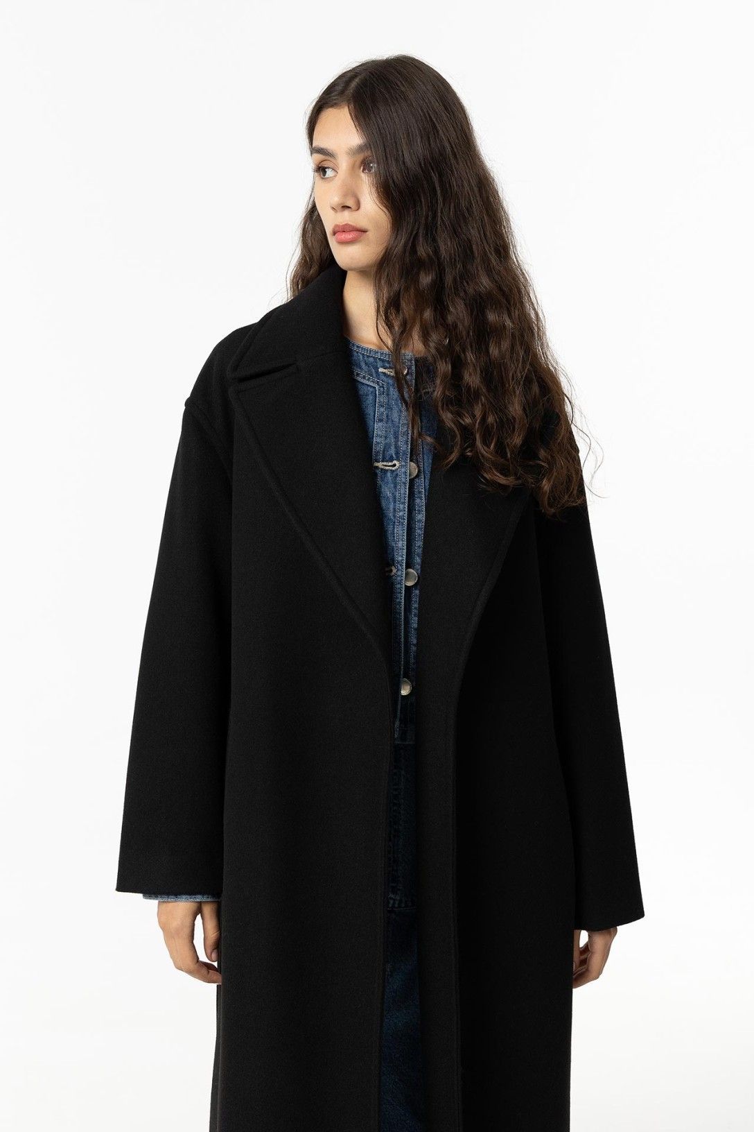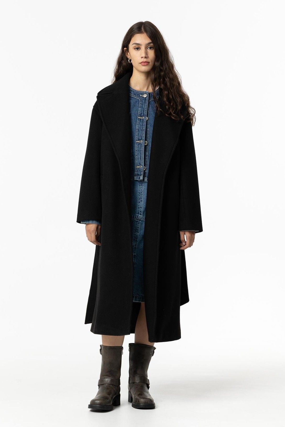 Abrigo relaxed fit con cuello de solapa y manga larga. Bolsillos laterales de vivo. Cinturón ajustable del mismo tejido. Interior forrado.