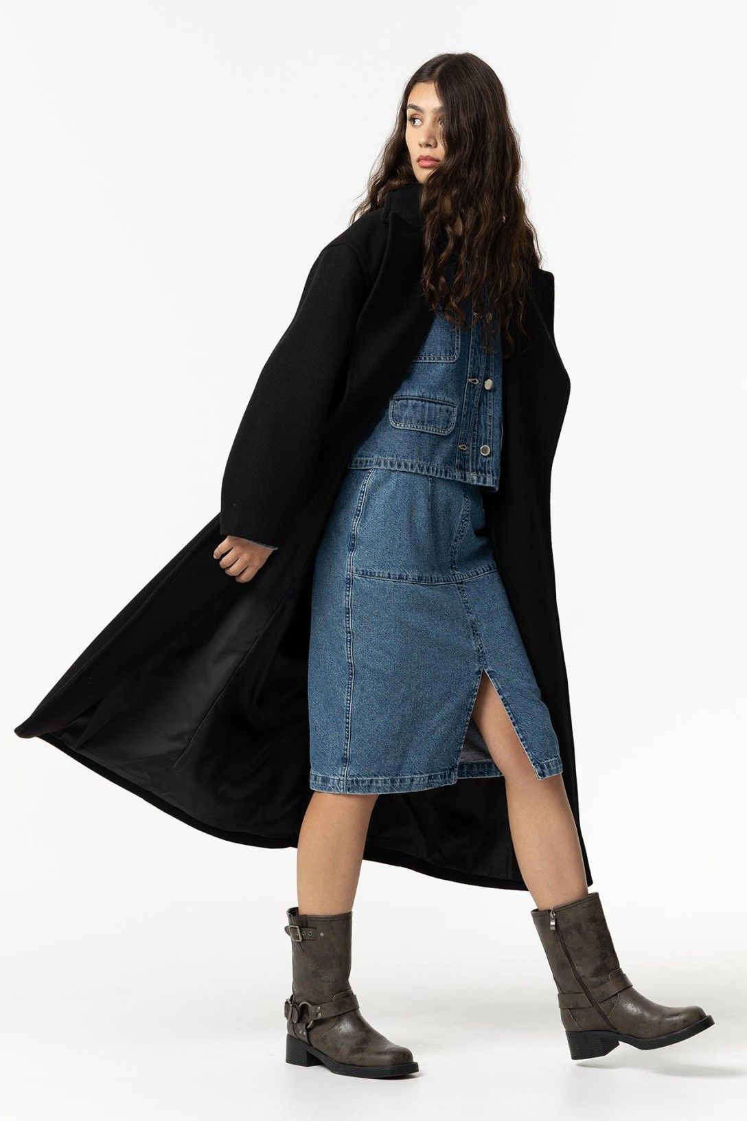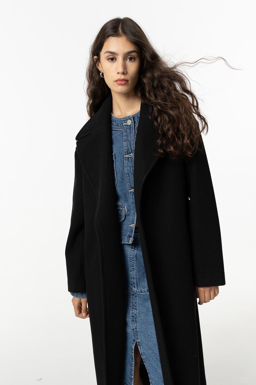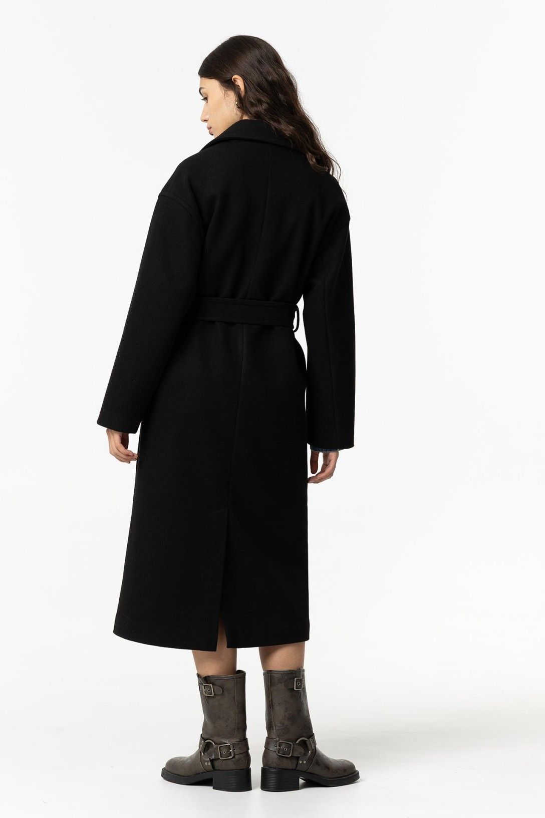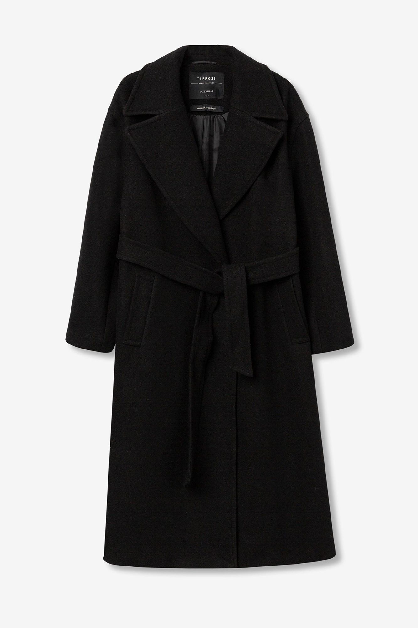 Abrigo relaxed fit con cuello de solapa y manga larga. Bolsillos laterales de vivo. Cinturón ajustable del mismo tejido. Interior forrado.