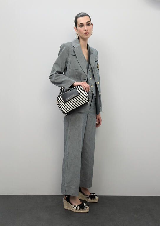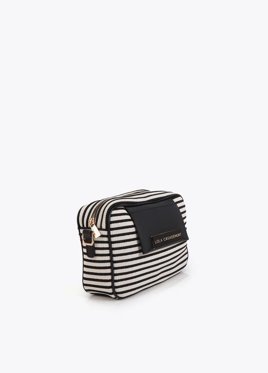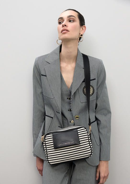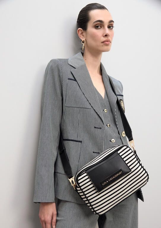 Bolso bandolera con diseño a rayas y detalles en efecto piel. Cierre con cremallera dorada y correa ajustable. Presenta una placa con el logotipo de la marca al frente, combinando estilo y funcionalidad en un accesorio ideal para el día a día.