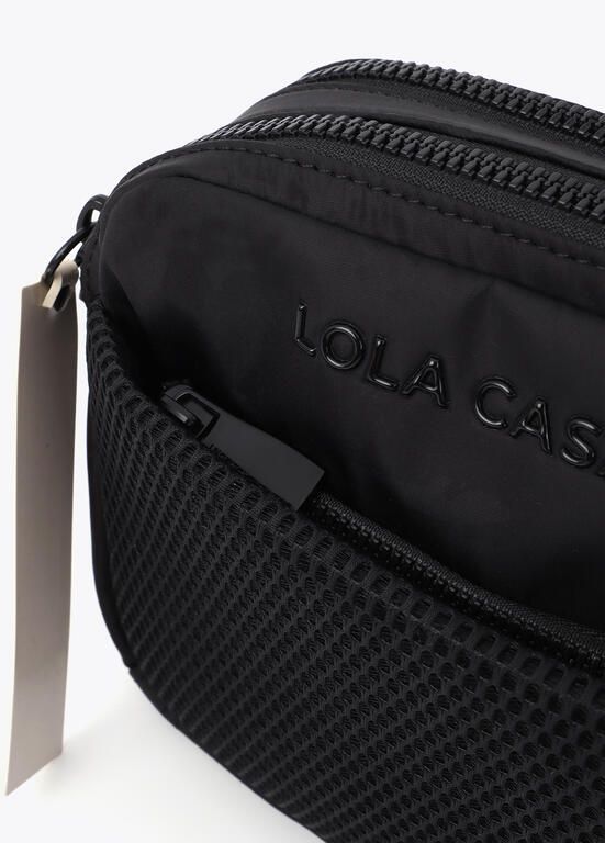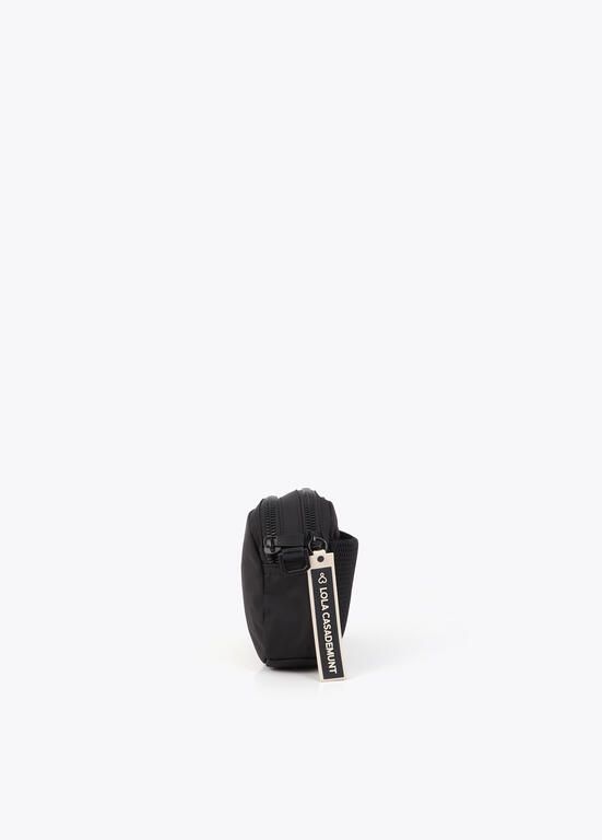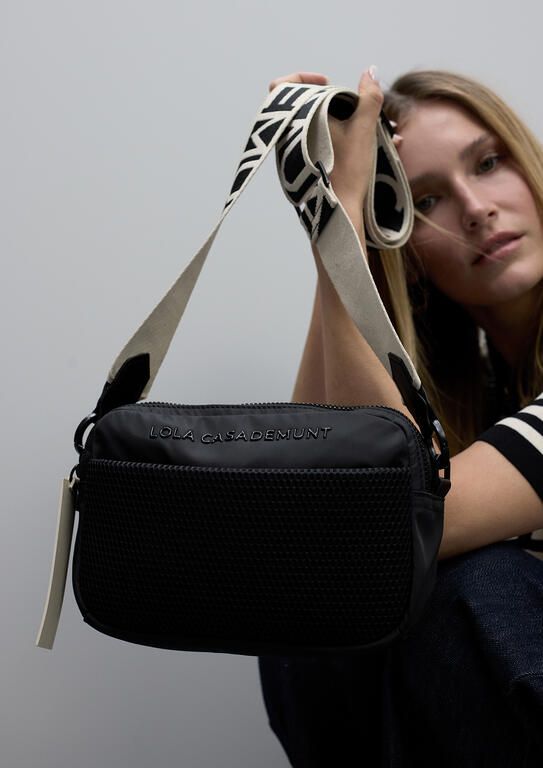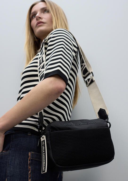 Bandolera de nylon resistente en color negro, perfecta para el día a día. Incluye un amplio compartimento principal y un bolsillo frontal texturizado. Correa ajustable con logotipo para mayor comodidad y estilo.