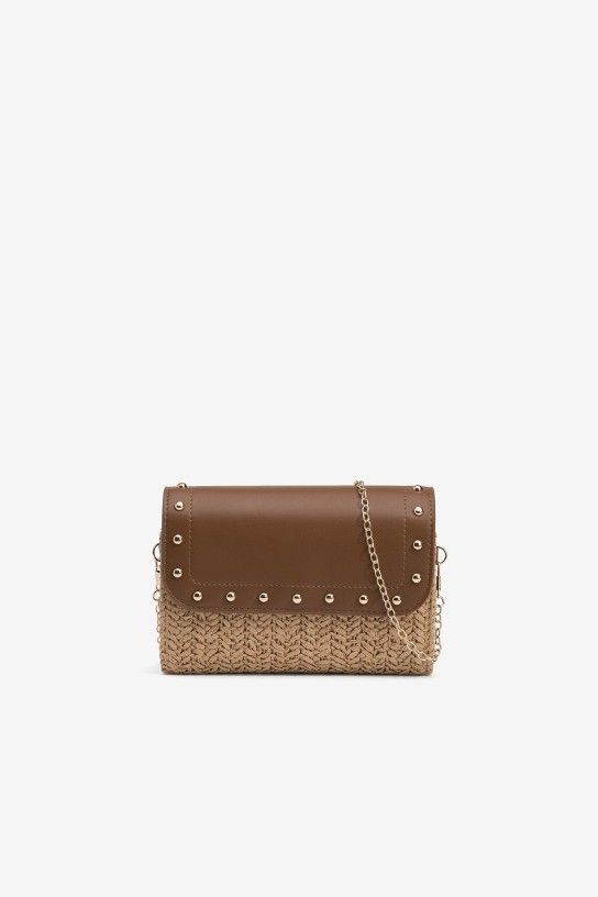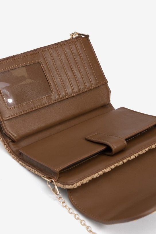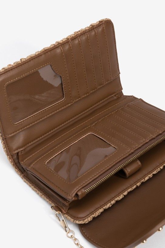 Monedero marrón con detalles metálicos y textura trenzada.