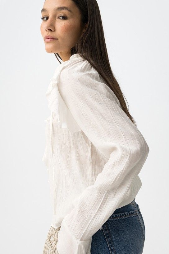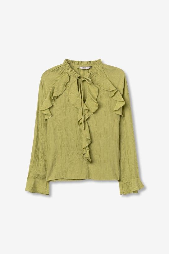 Blusa de manga larga en color crudo o verde, con volantes y corte regular, estilo casual chic.