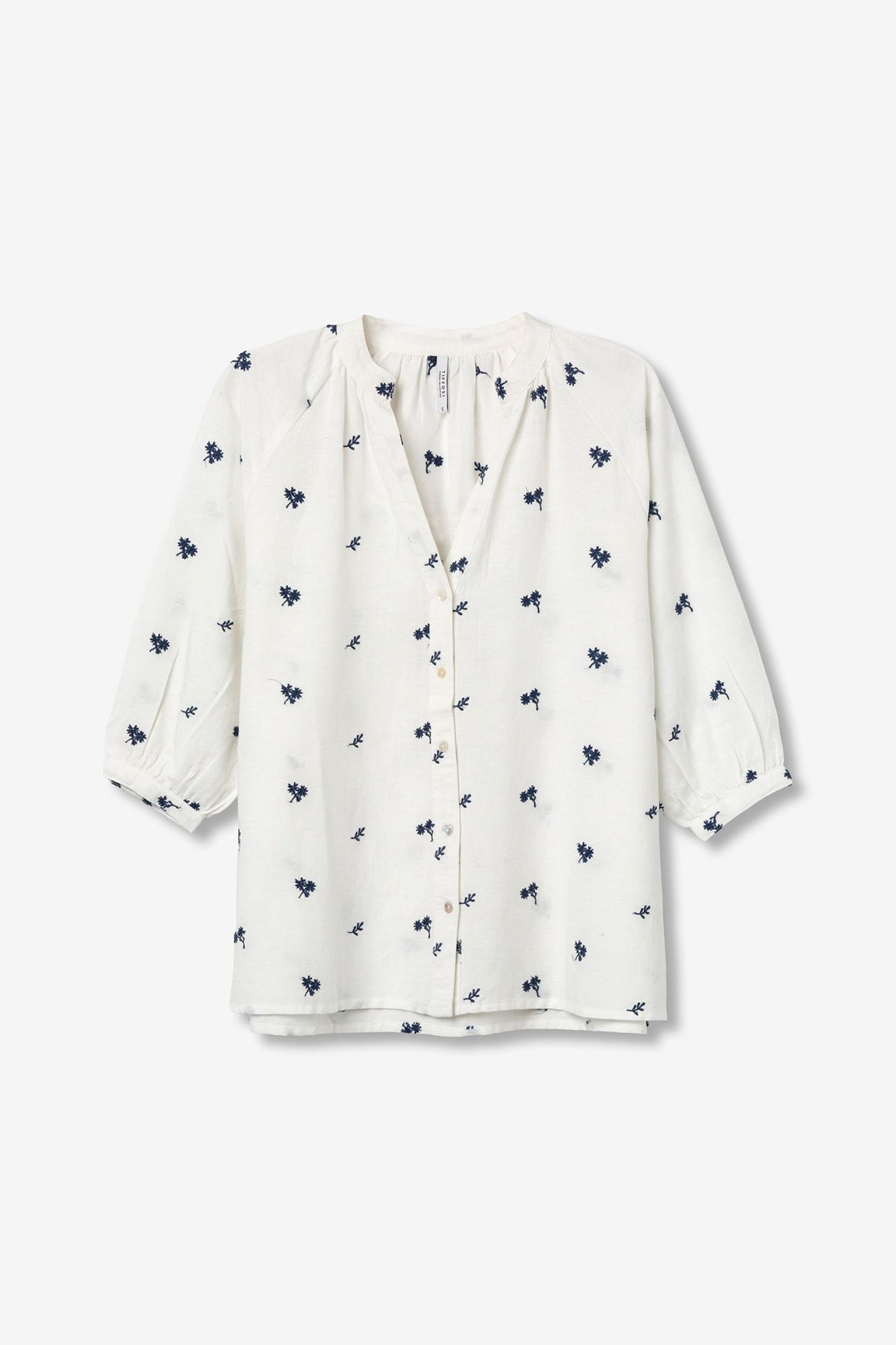 Camisa de corte holgado, manga larga, abotonada, con bordados azul oscuro y estilo minimalista casual.