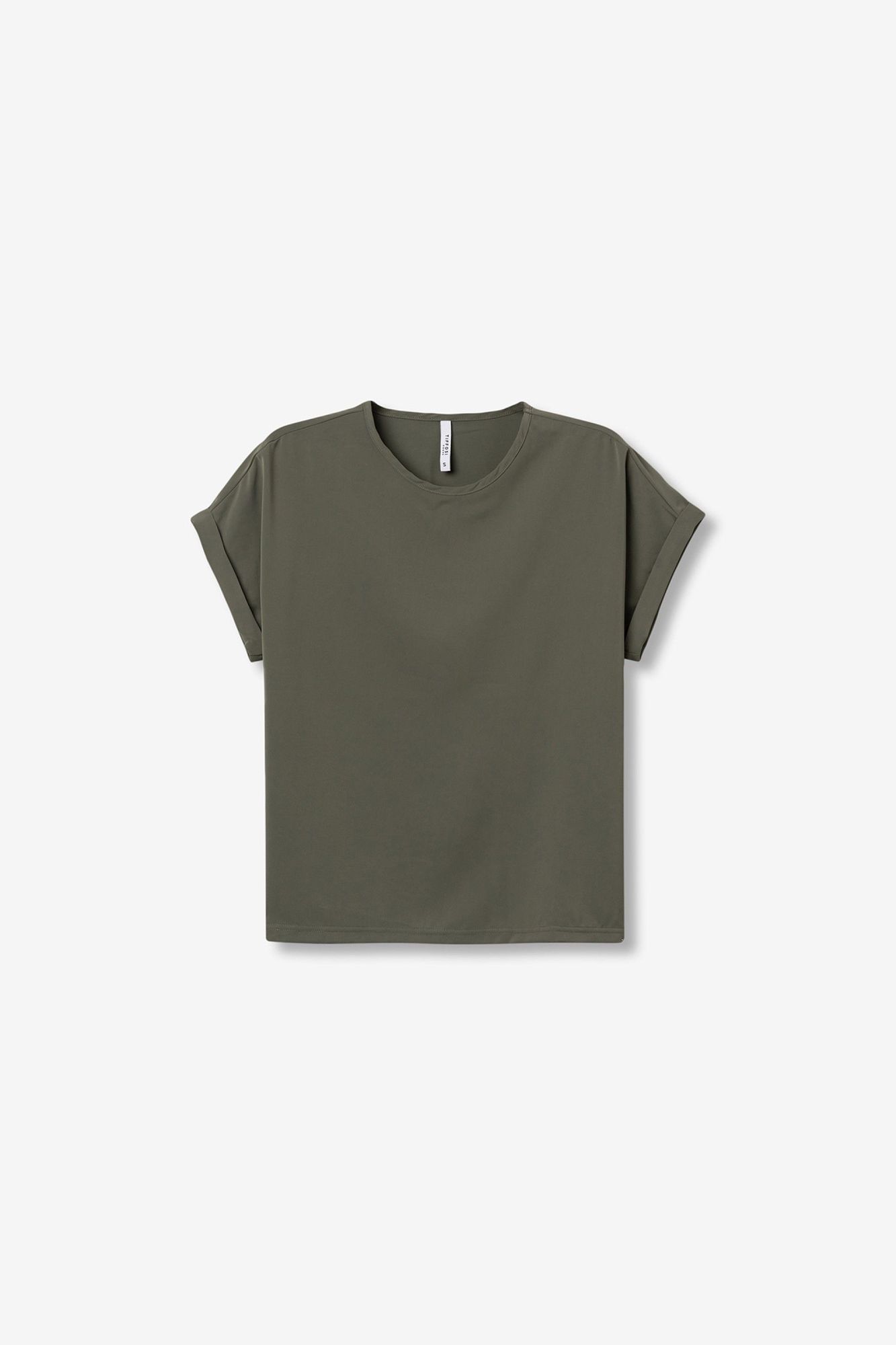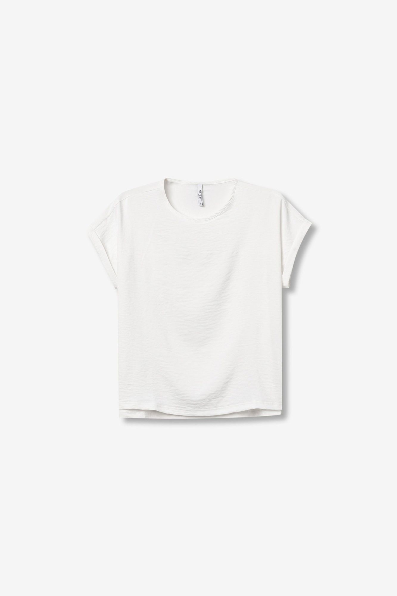 Blusa de corte relaxed, manga corta y cuello redondo, estilo minimalista y casual.