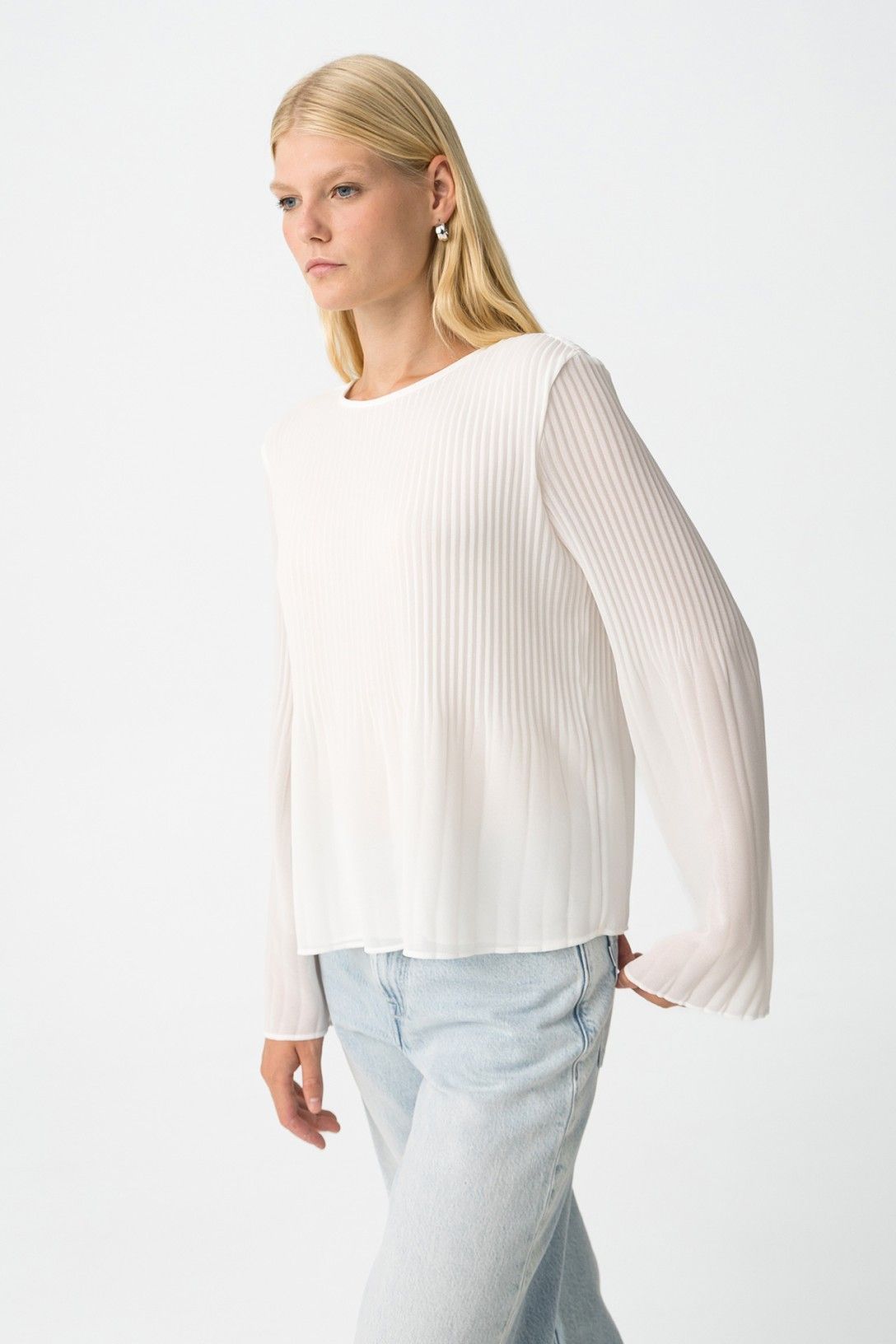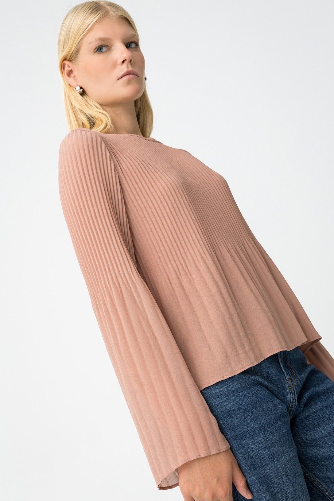 Blusa de corte regular plisada con cierre de botón trasero, escote redondo y manga corta.