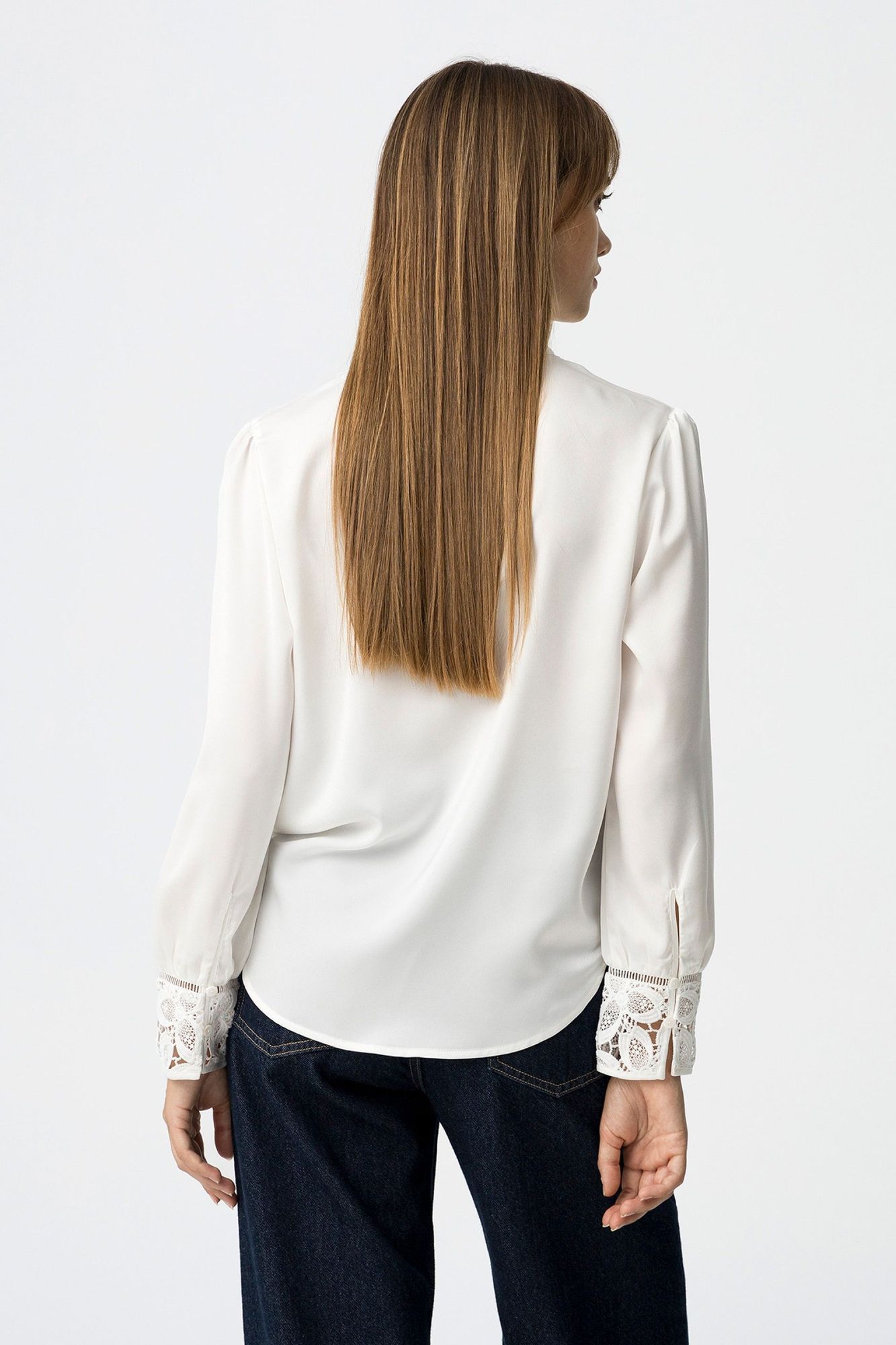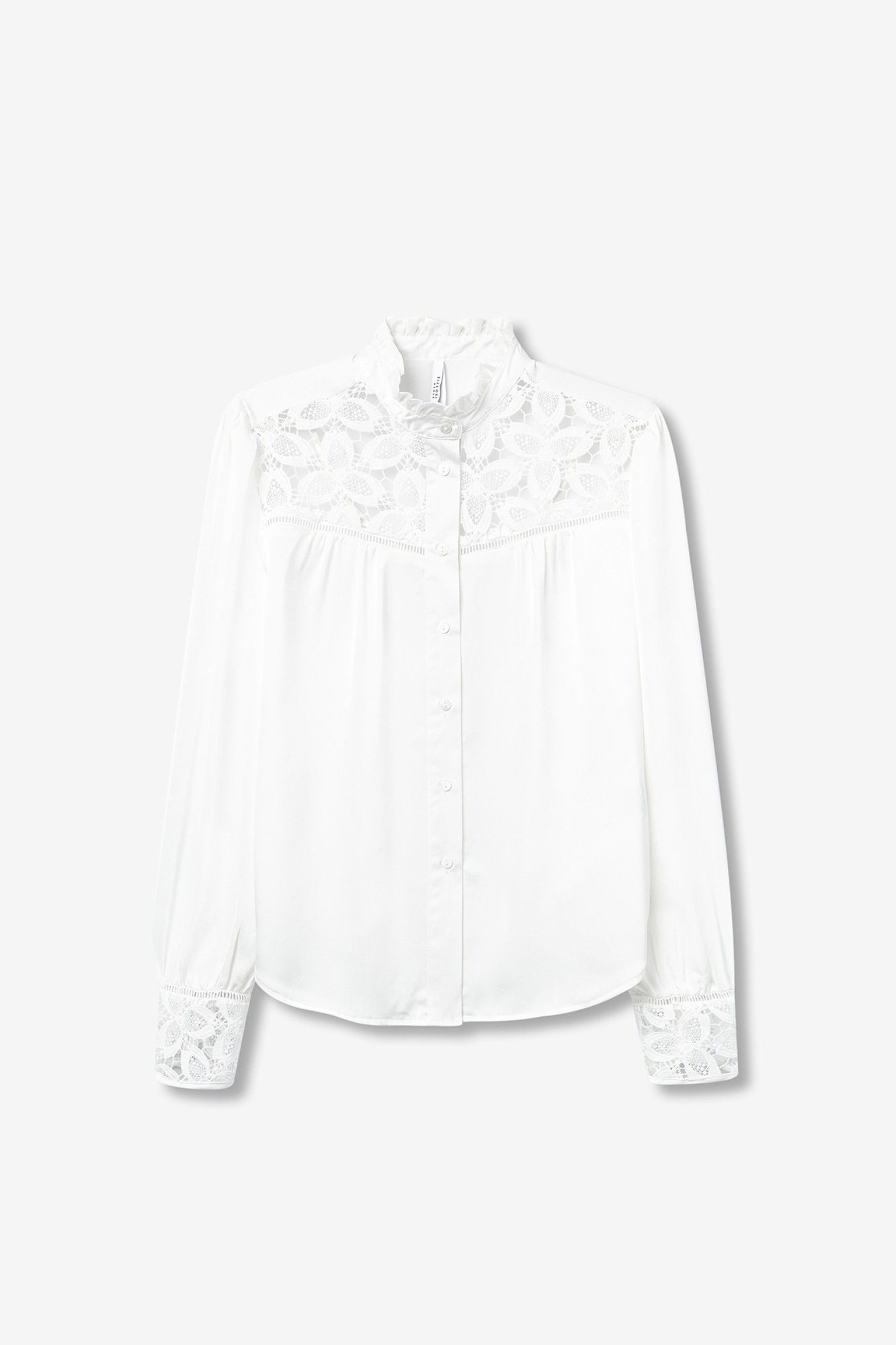 Camisa regular fit satinada, con recortes de encaje de crochet y cuello redondo con volante. Cierre de botón, manga larga y bajo curvo.