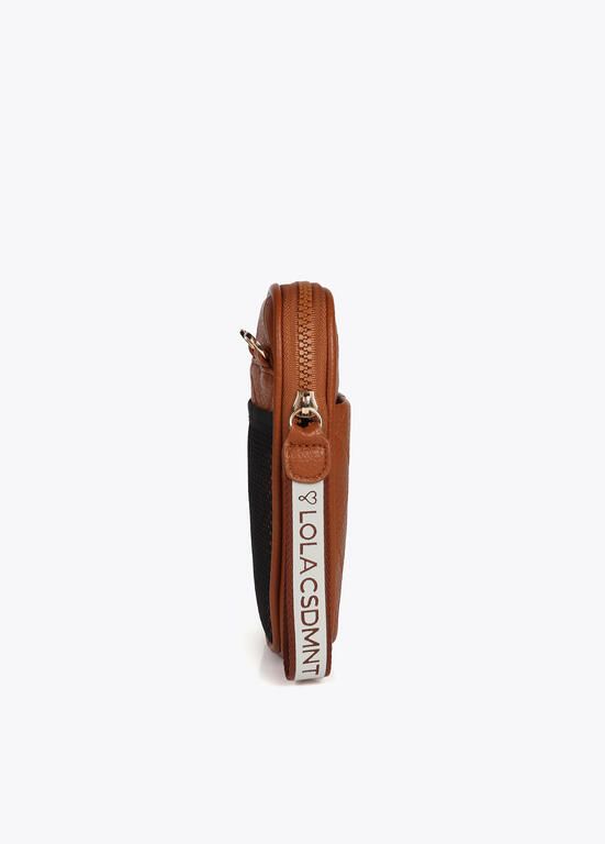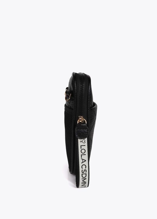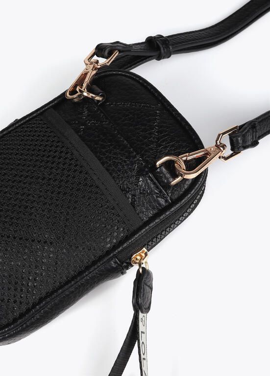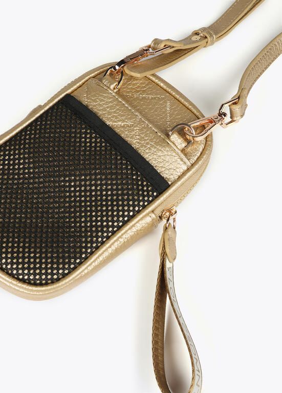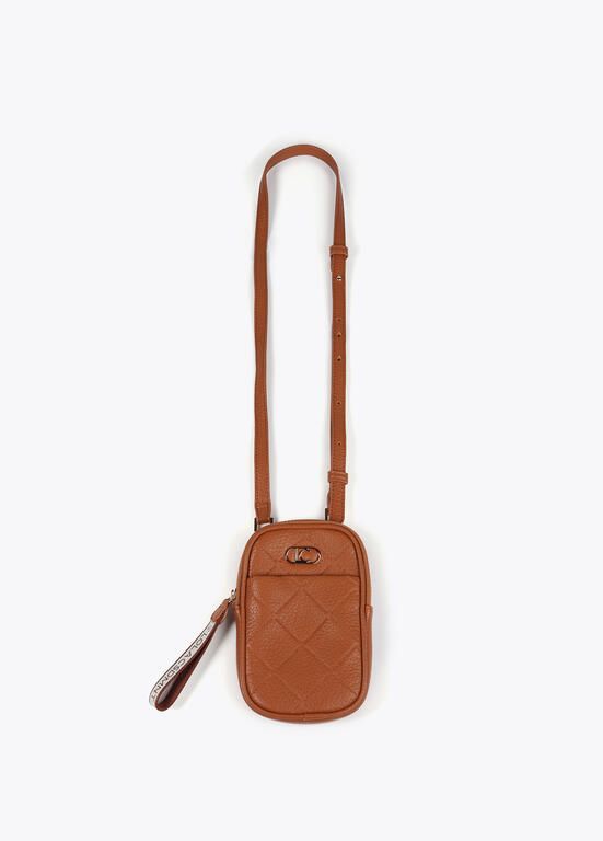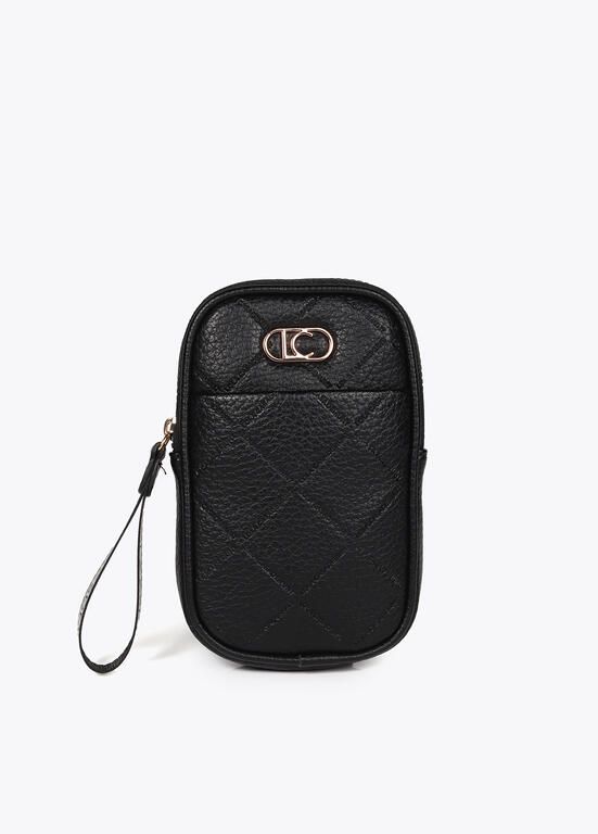 Bolsito móvil elegante con diseño de monograma en rombos. Confeccionado en material resistente con correa ajustable para mayor comodidad. Cierre superior con cremallera y detalles de herrajes dorados. Incluye cinta de mano con logotipo.