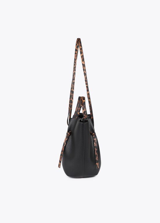 Bolso mini shopper confeccionado en material sintético con efecto piel y detalles de animal print. Compartimento interior con cremallera y cierre magnético. Correas ajustables para mayor comodidad.