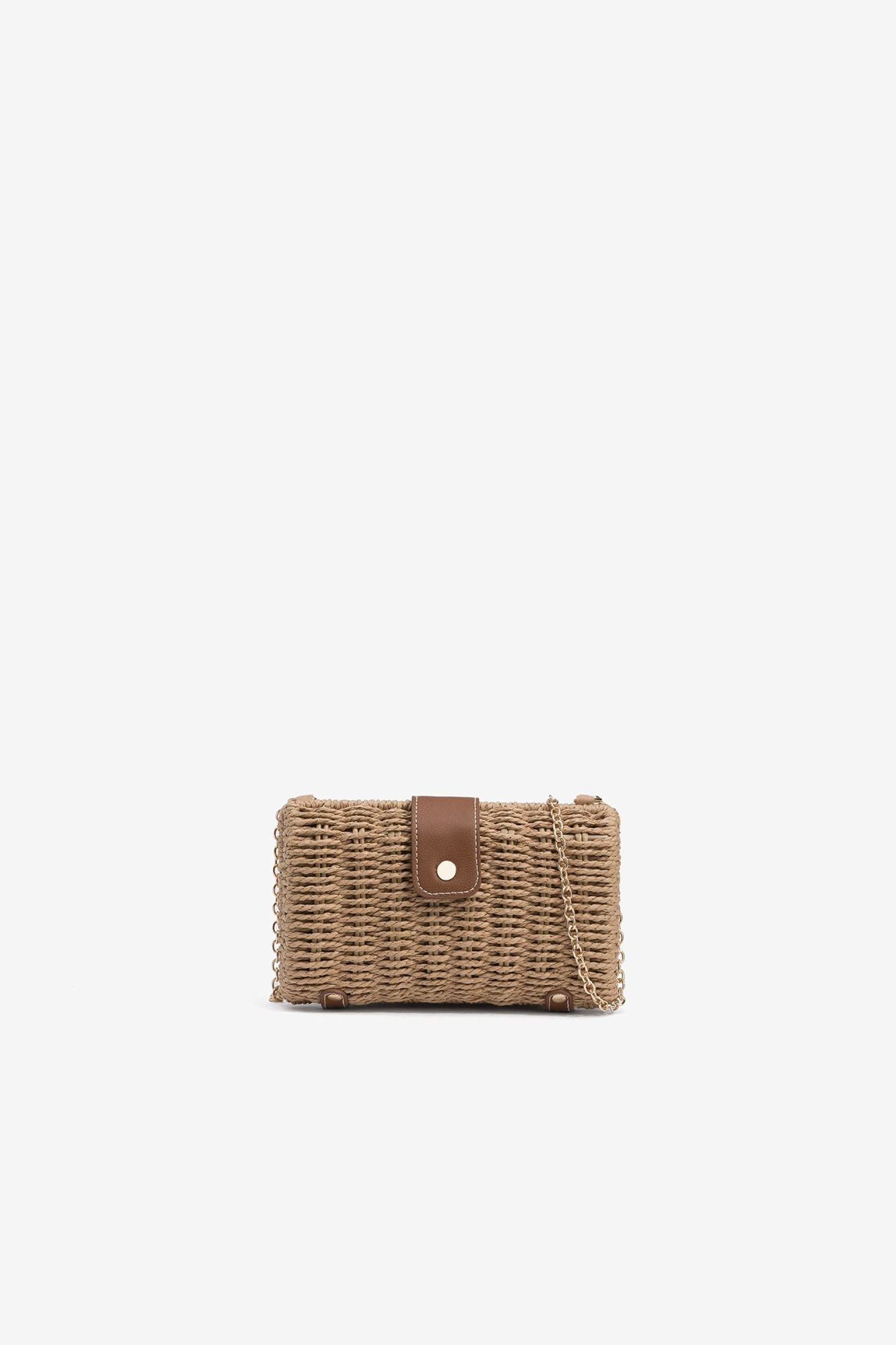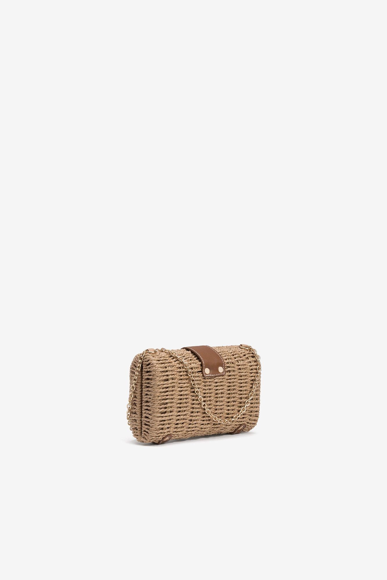 Clutch marrón con textura trenzada, cierre magnético y cadena dorada desmontable.