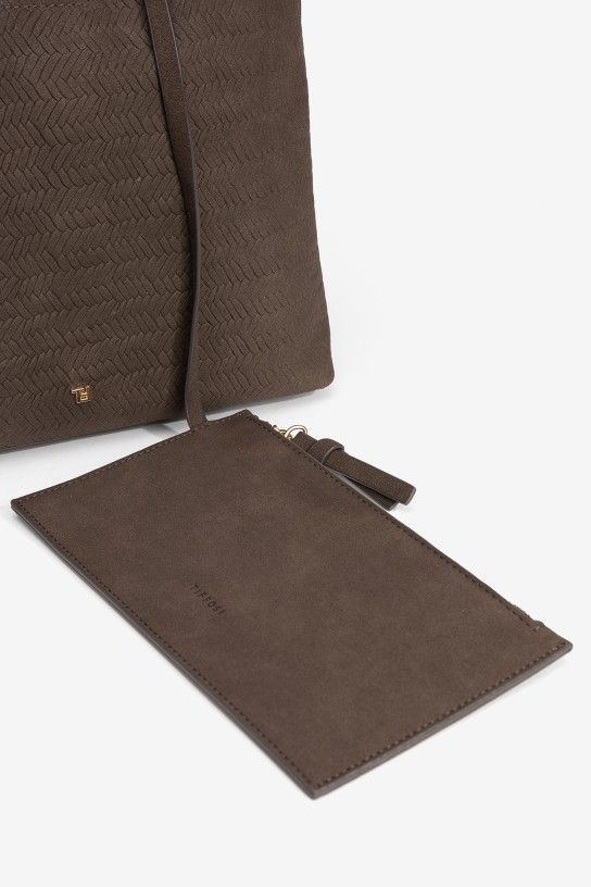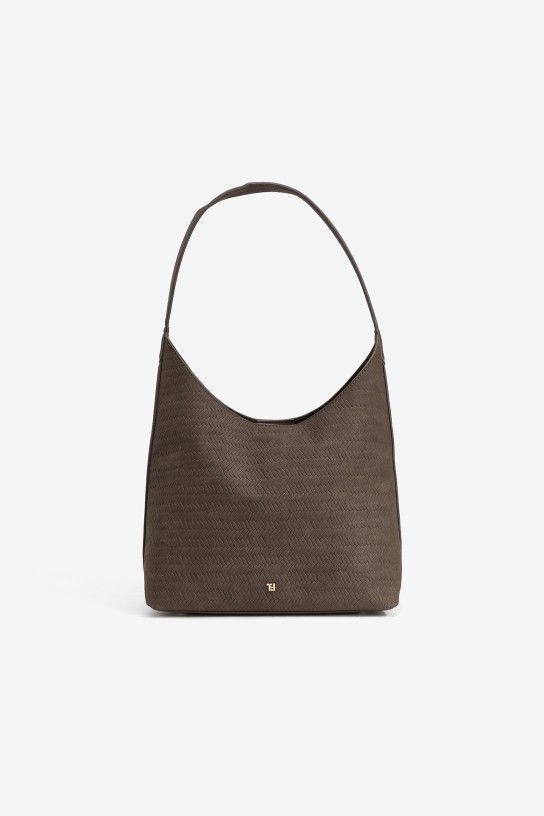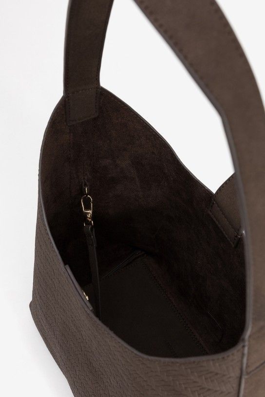 Bolso de hombro en tono chocolate con textura geométrica y cierre magnético. Incluye cartera interior.