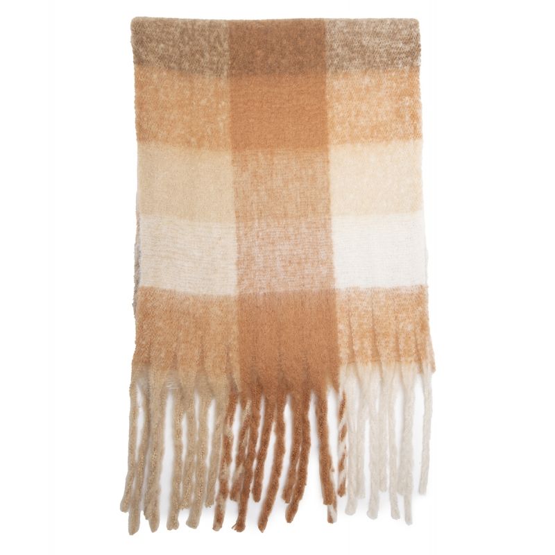 Bufanda abrigada en tacto suave. de cuadrados con fleco largo en los dos extremos. Medidas: 40 x 210 cm + flecos. Composición: 100º/ₒ poliéster. Peso: 240 gr.