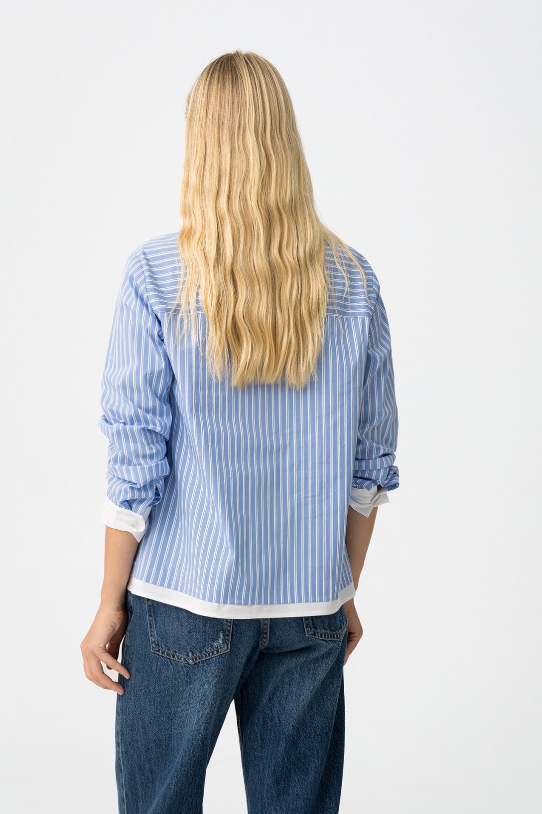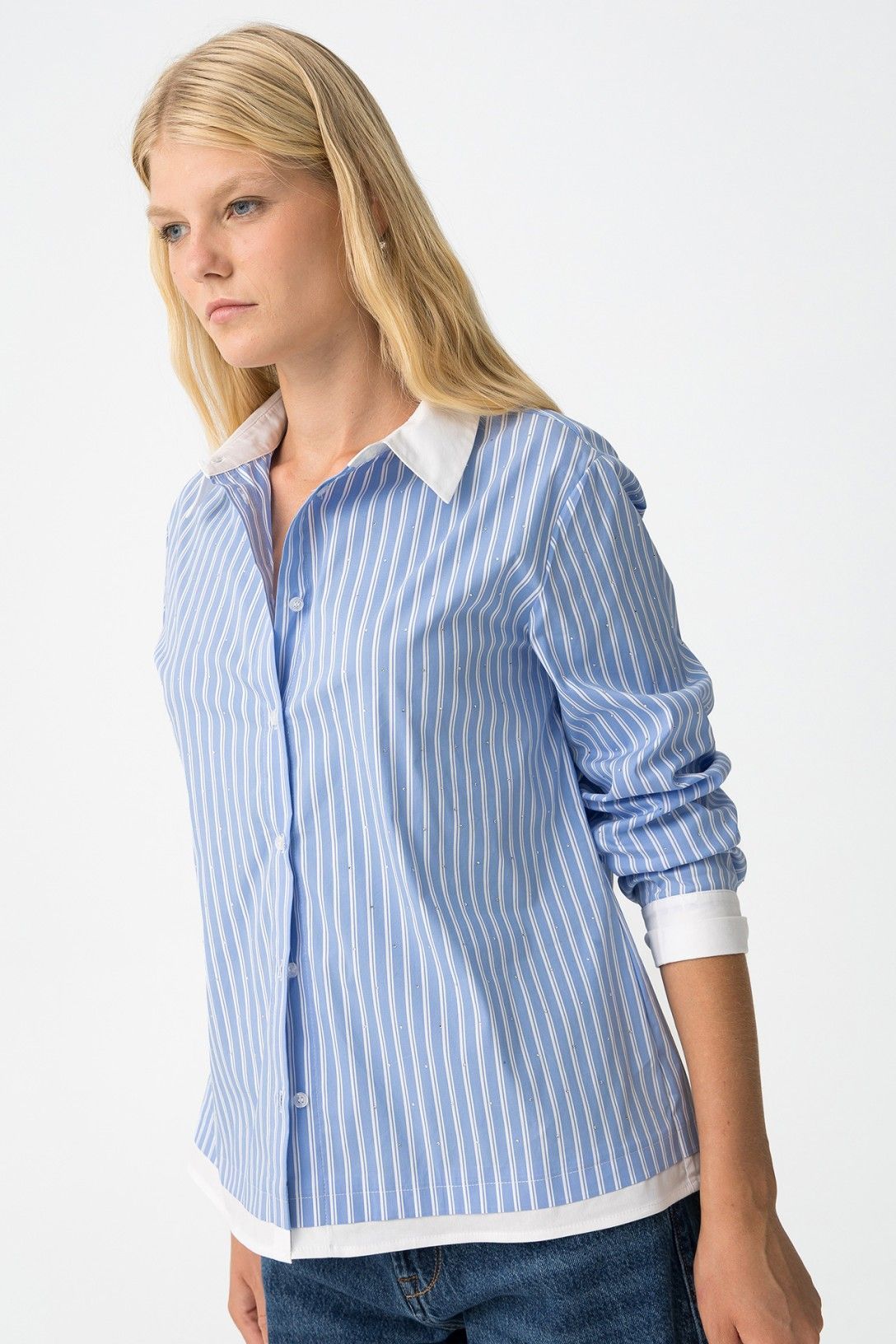 Camisa regular fit de rayas, con apliques brillantes y contraste de color. Cuello clásico, cierre de botones y manga larga con puños abotonados.