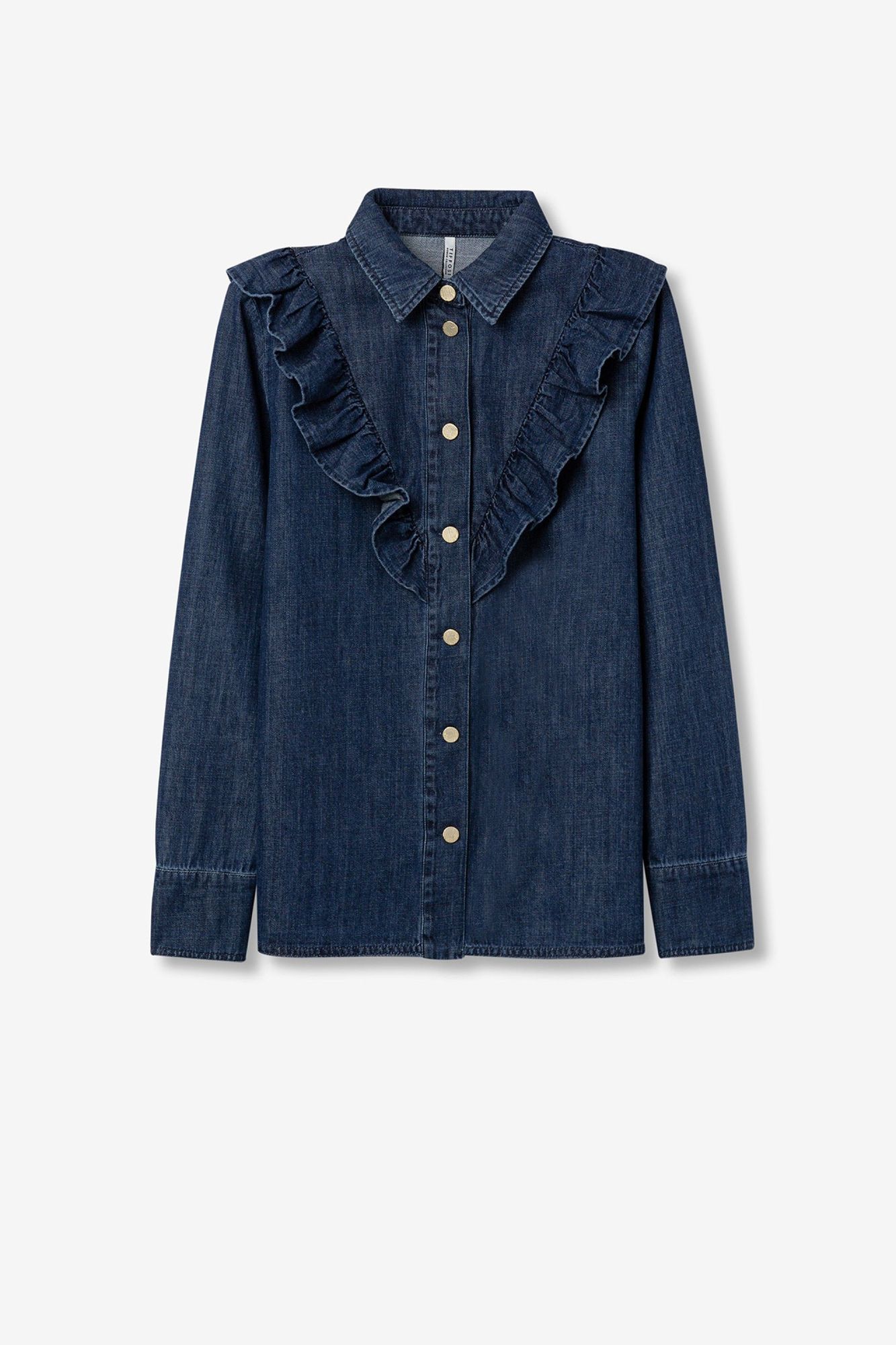 Camisa de manga larga en denim con cuello de solapa. Cierre frontal de botones metálicos. Detalle de volantes aplicados desde el hombro hasta el pecho. Puños con acabado sencillo.