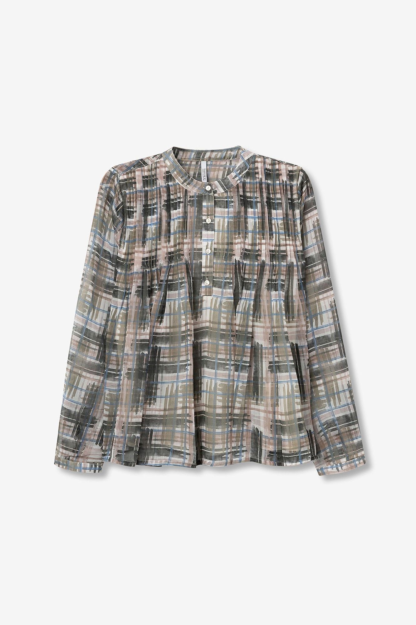 Blusa fluida estampada, con escote redondo, cierre frontal de botón y manga larga.