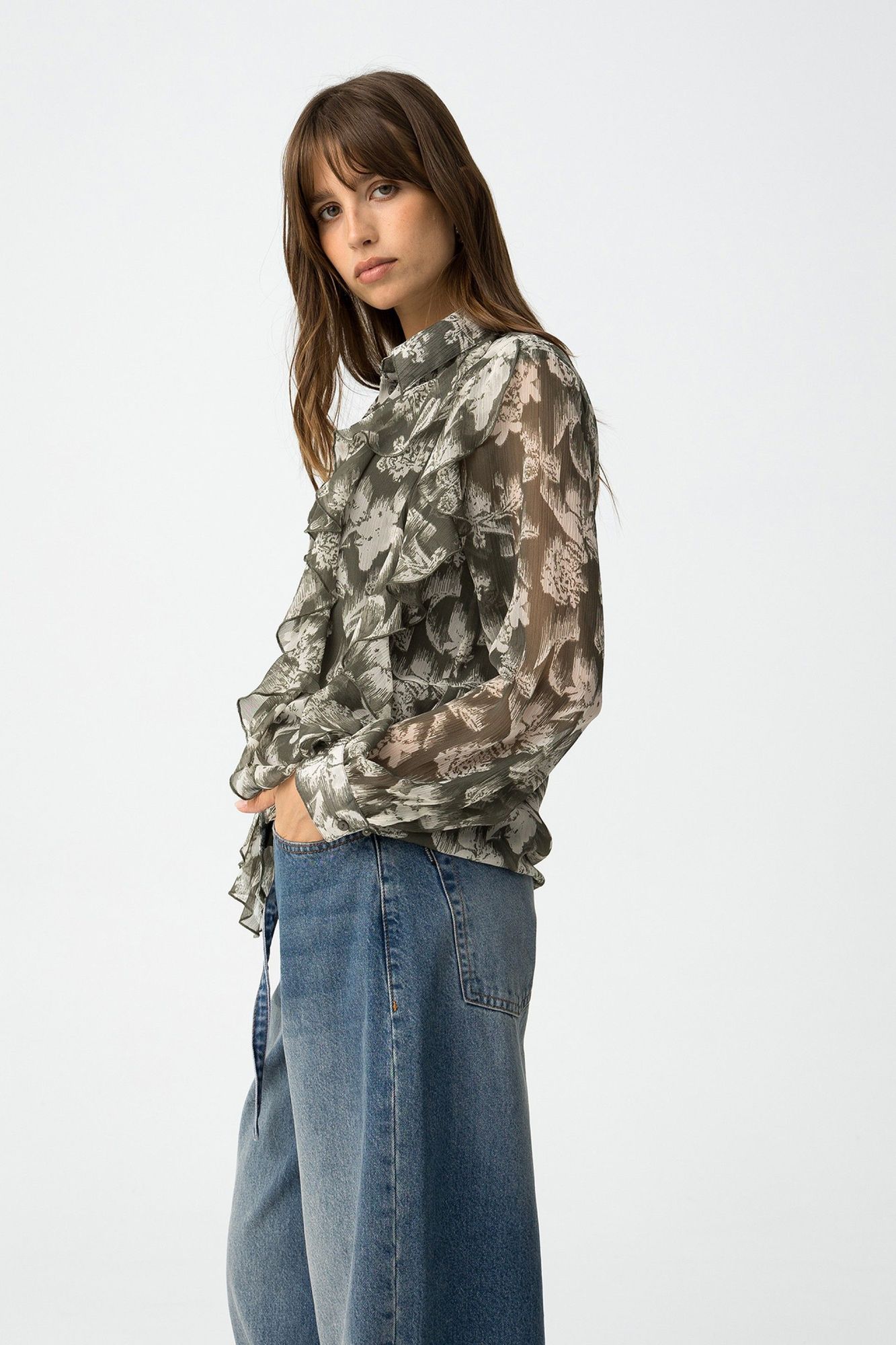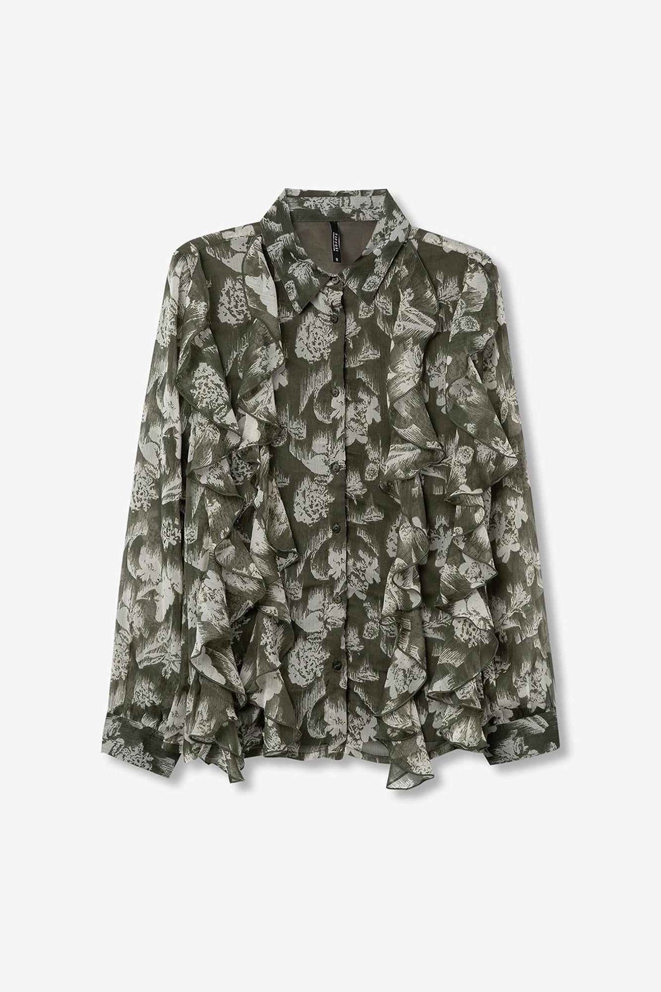 Camisa regular fit semitransparente con estampado all over y volantes frontales. Cuello, apertura frontal con botones y manga larga. Interior con forro.
