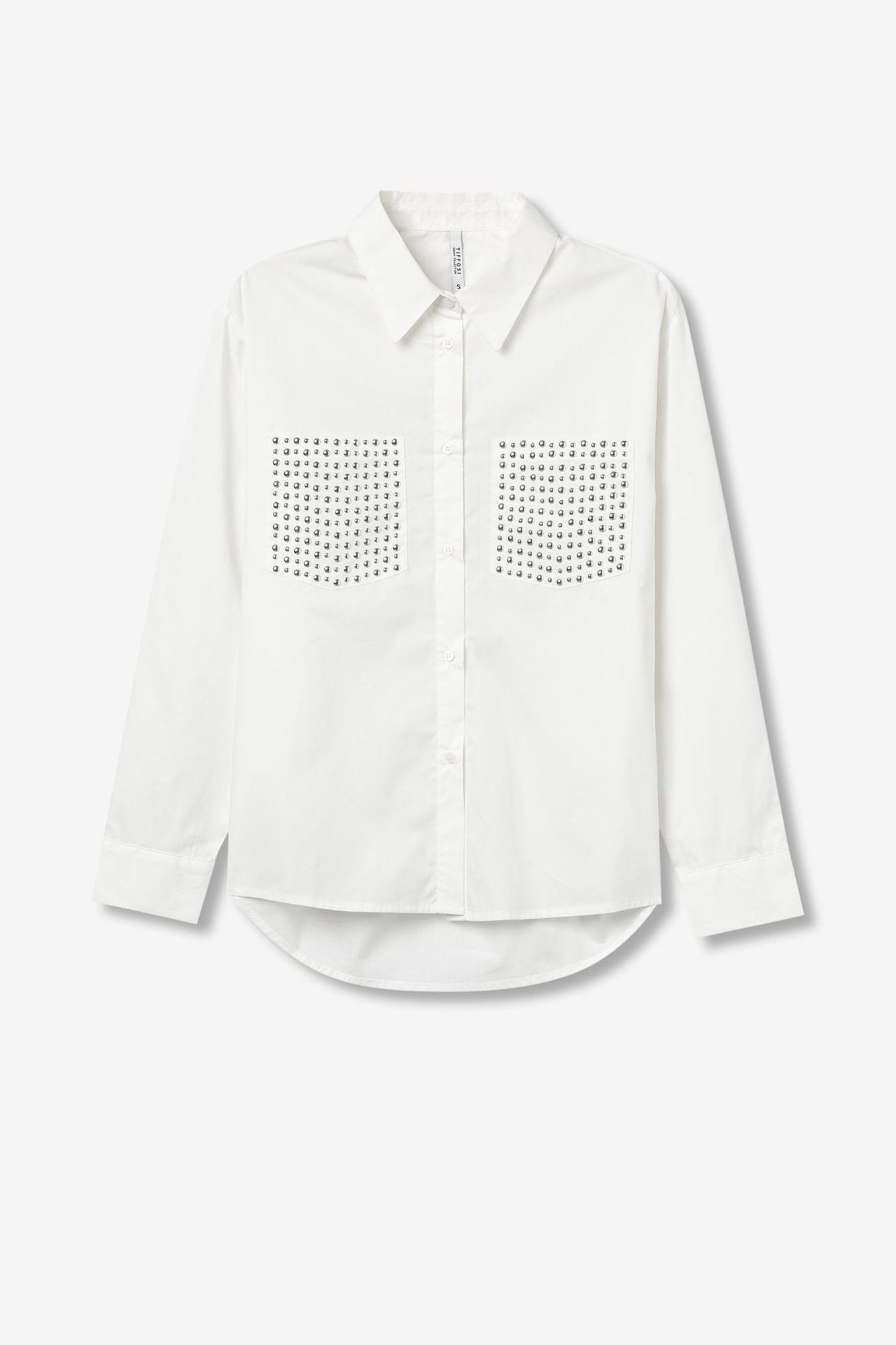 Camisa relaxed fit de algodón, con dos bolsillos de parche frontales y apliques metálicos. Cuello camisero, manga larga con botones en los puños y bajo curvo asimétrico.