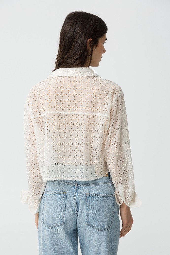 Camisa corta con cuello solapa y manga larga. Cierre frontal con botones.
