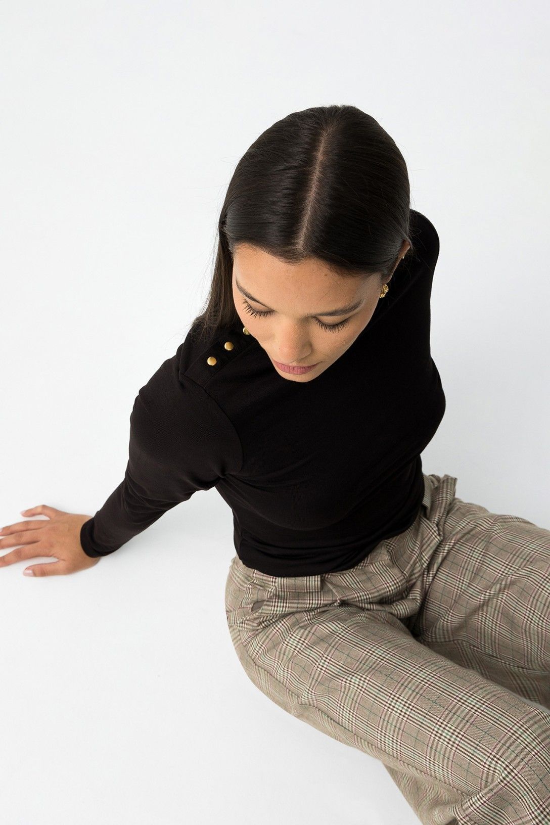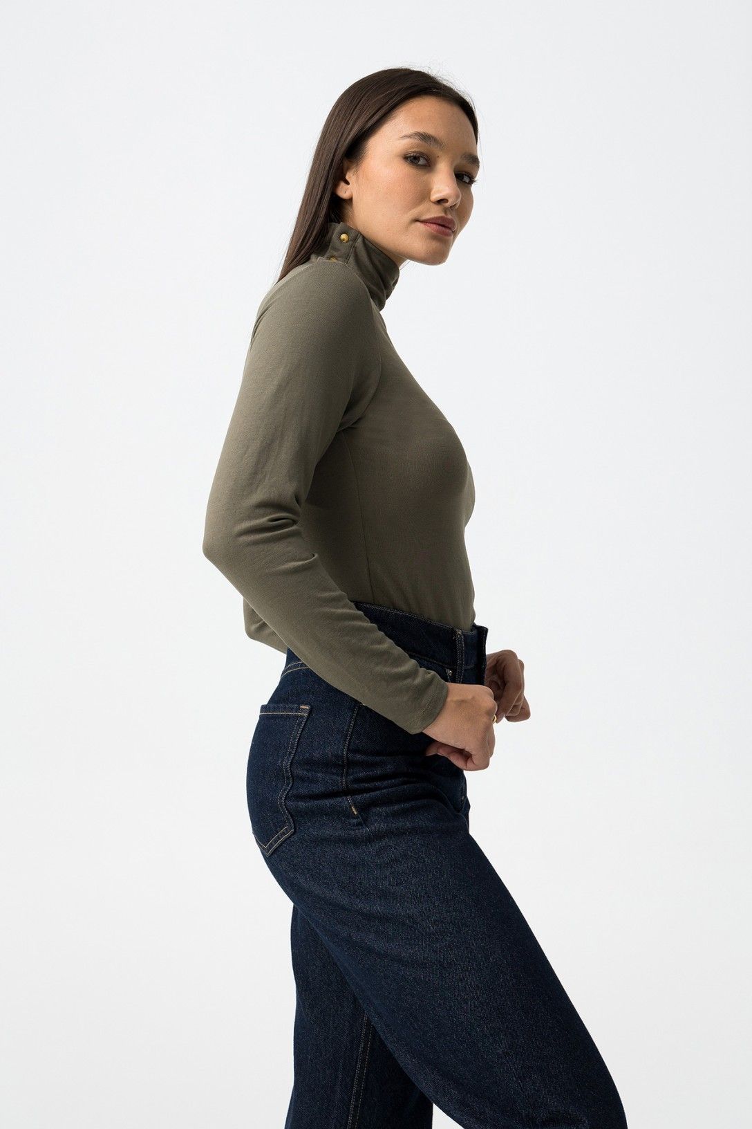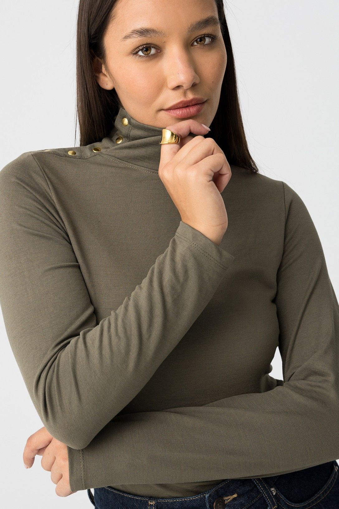 T-shirt Slim Fit de manga larga y cuello alto con botones metálicos laterales, Camiseta básica.