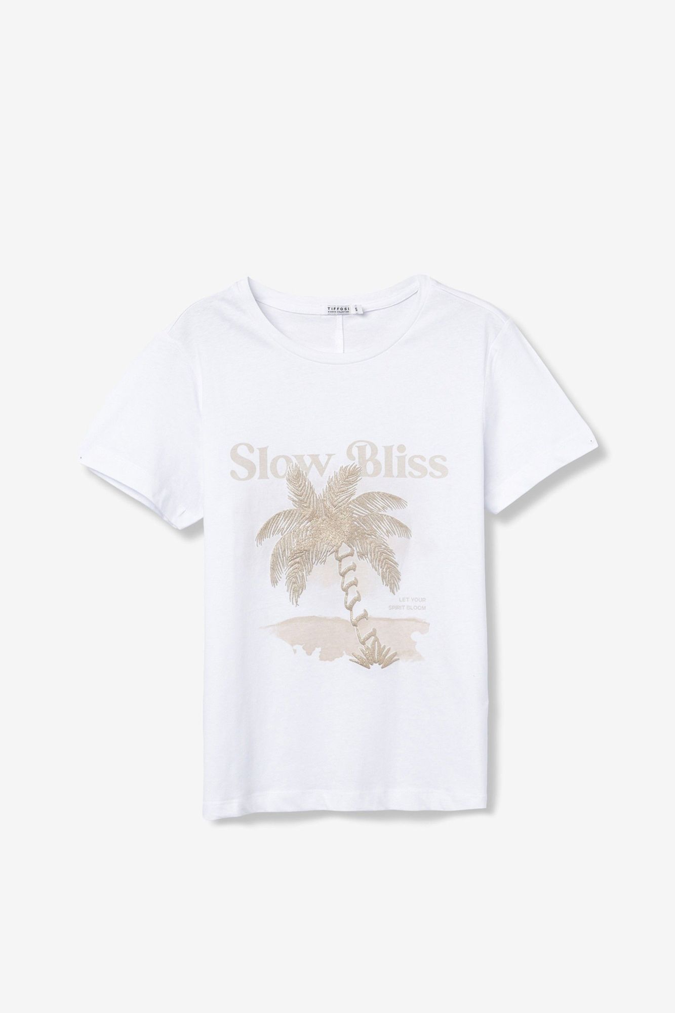 Camiseta de color blanco, corte regular, manga corta, con estampado de palmera y texto Slow Bliss delante.