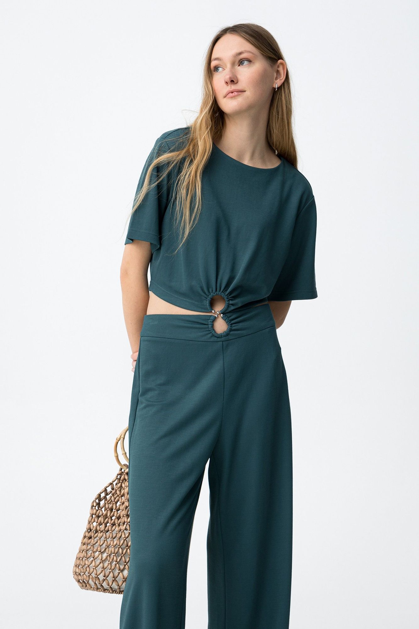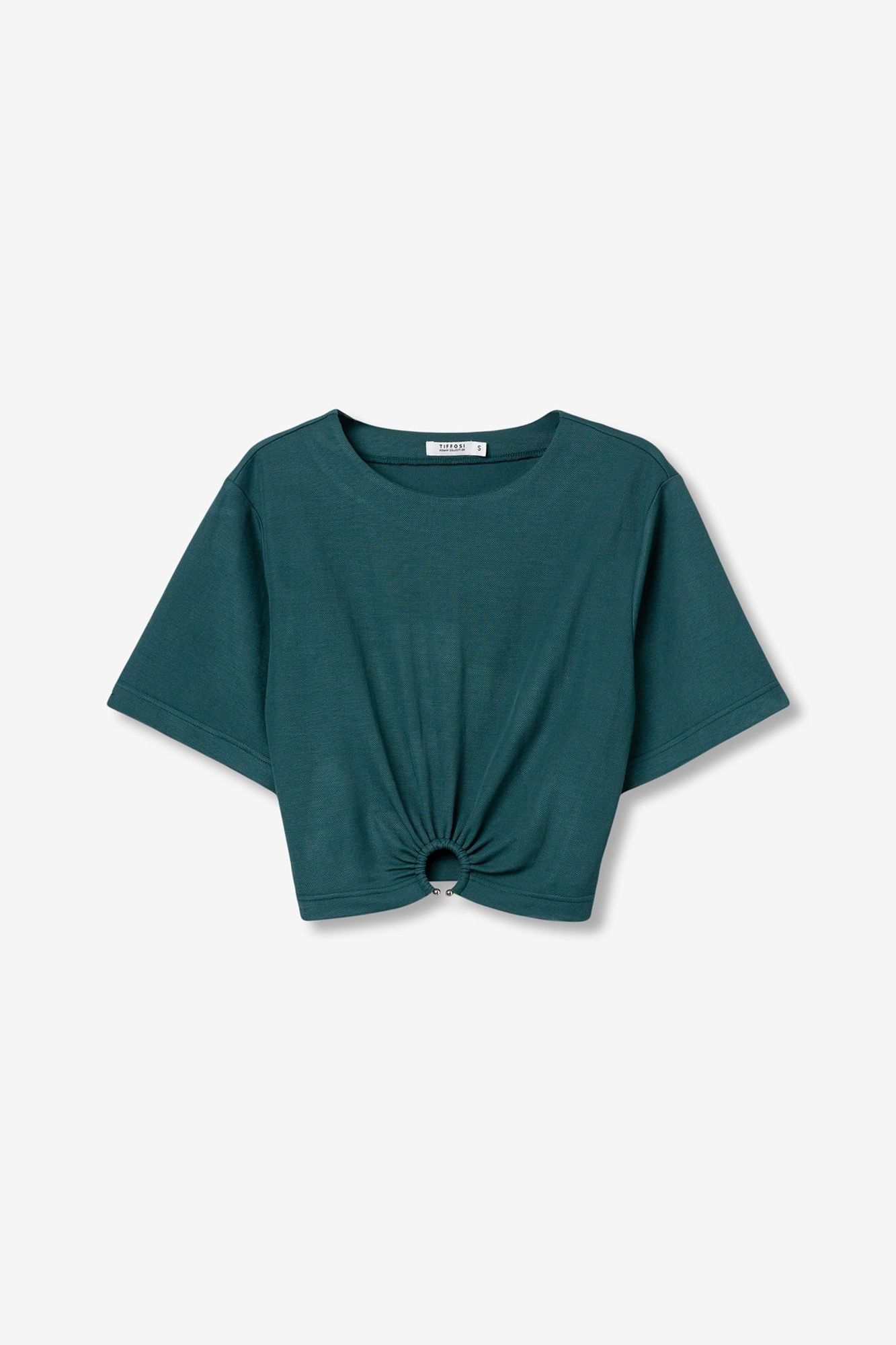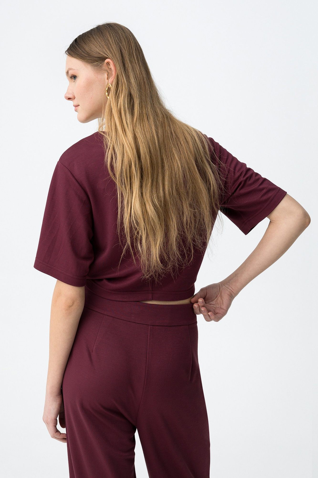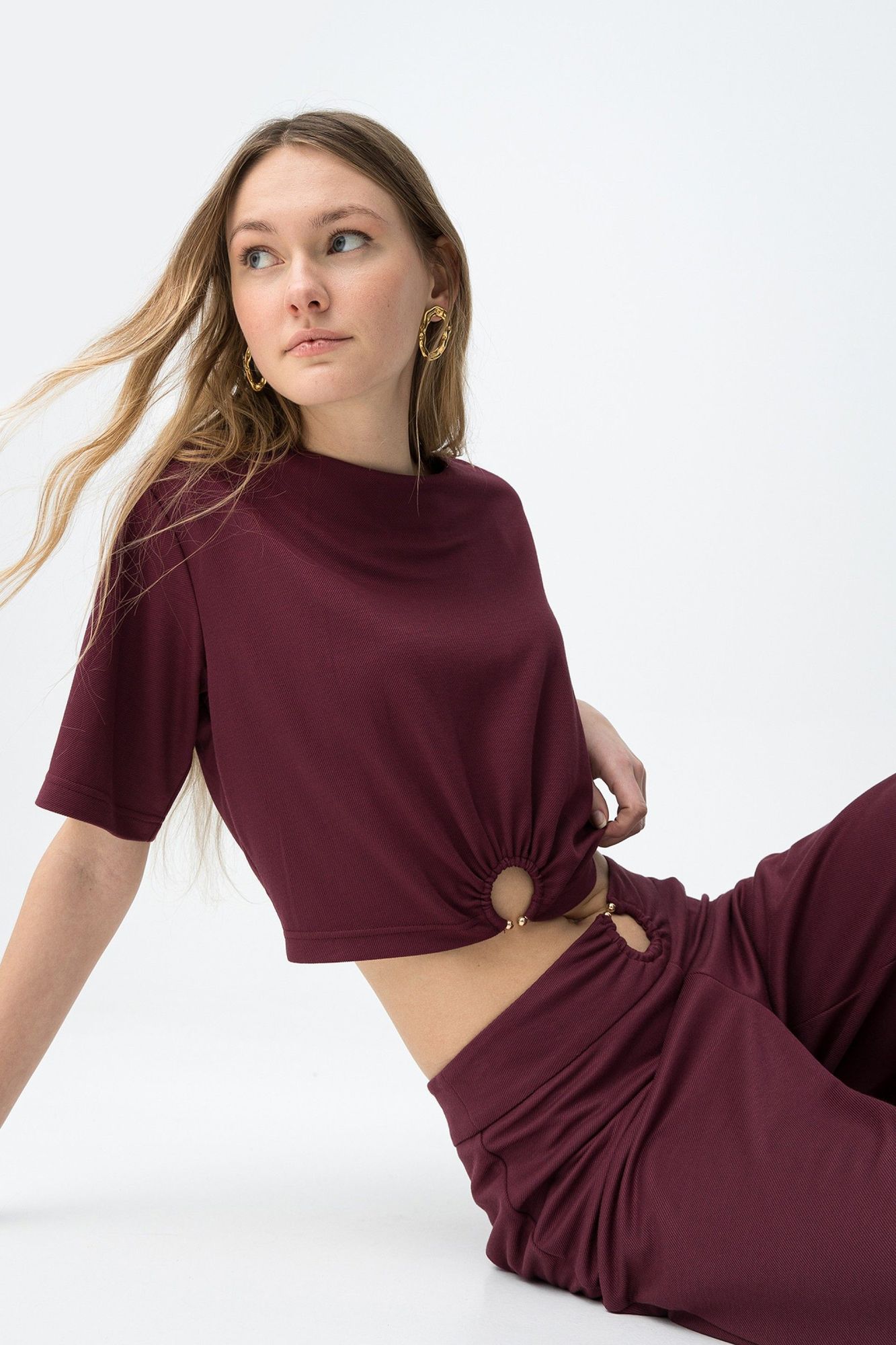 Corte oversize, manga corta, detalle de aro metálico en el centro y tono burdeos intenso.
