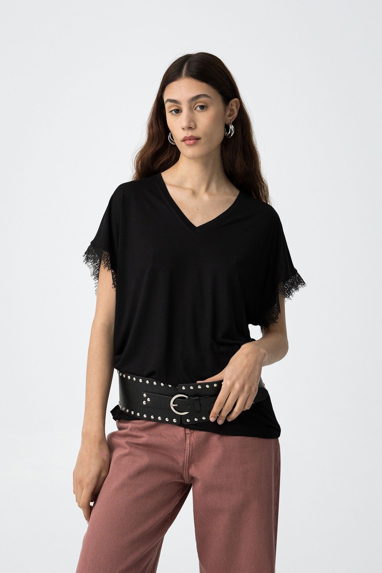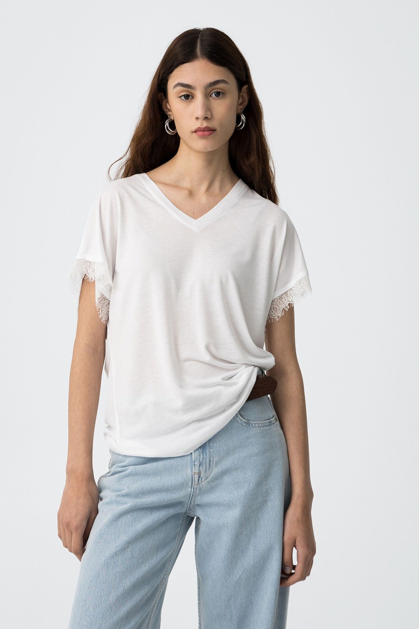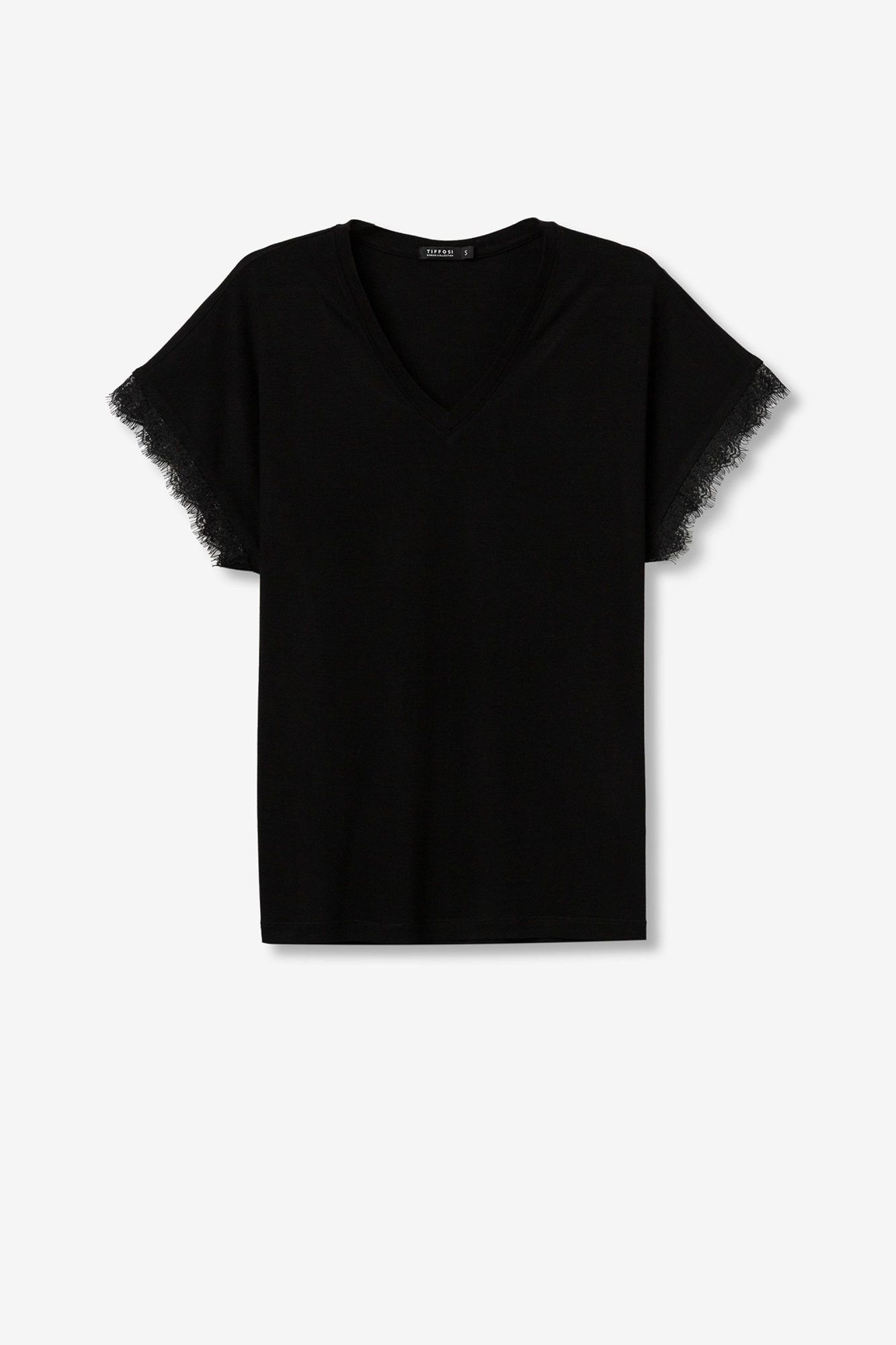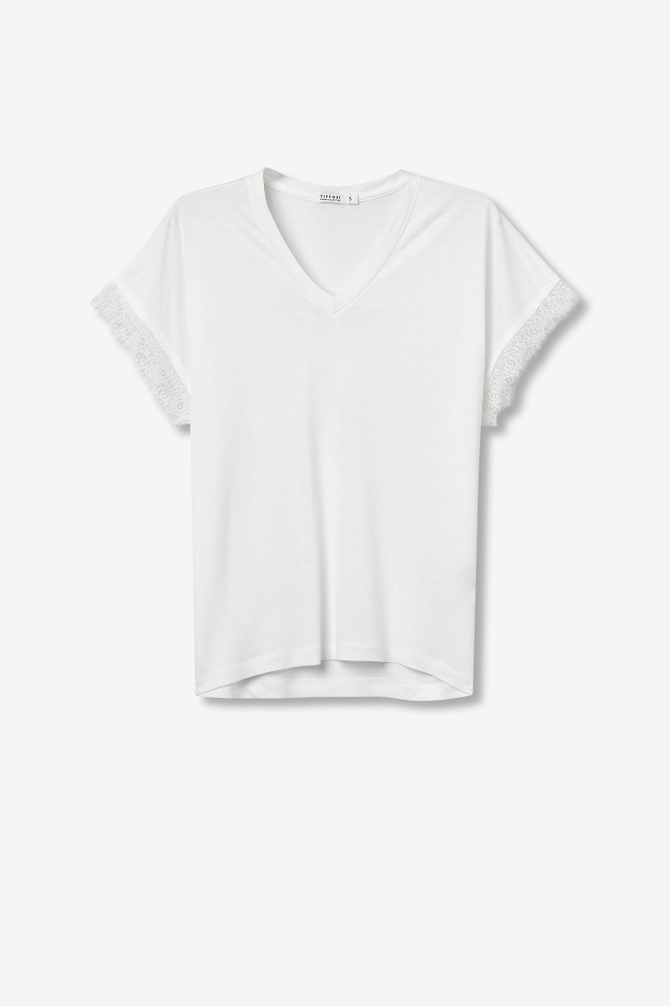 Camiseta básica de manga corta y cuello de pico con encaje en los extremos de las mangas.