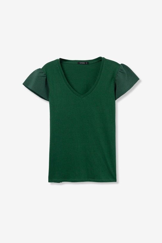 Camiseta verde de corte regular con mangas cortas y escote en V, estilo casual.