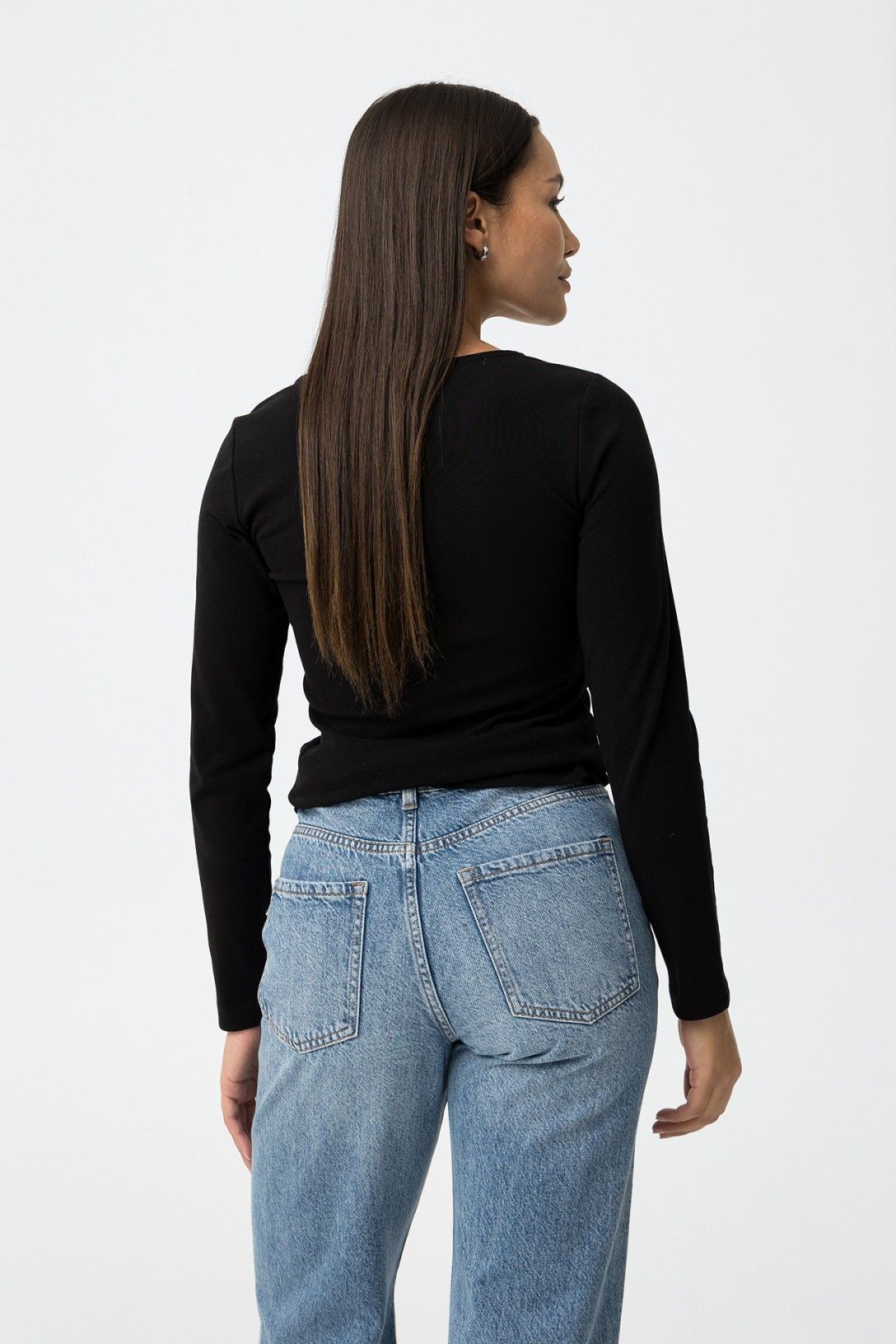 Camiseta super slim de manga larga con escote asimétrico y leve drapeado lateral. Detalle de hebilla metálica en hombro. Mayormente de algodón.