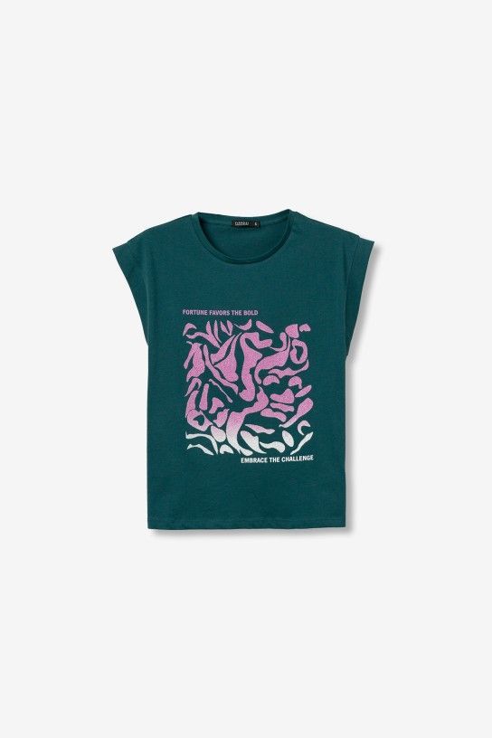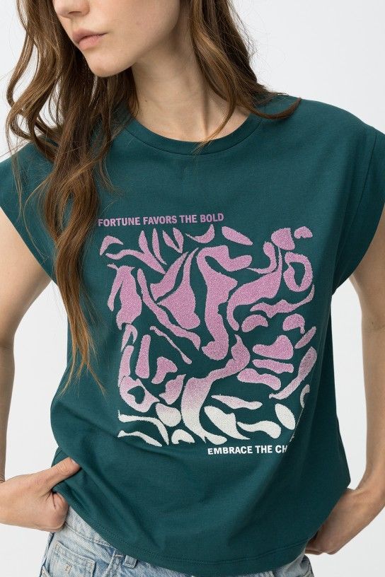 Camiseta verde con diseño gráfico en rosa y blanco. Corte regular y mangas cortas.