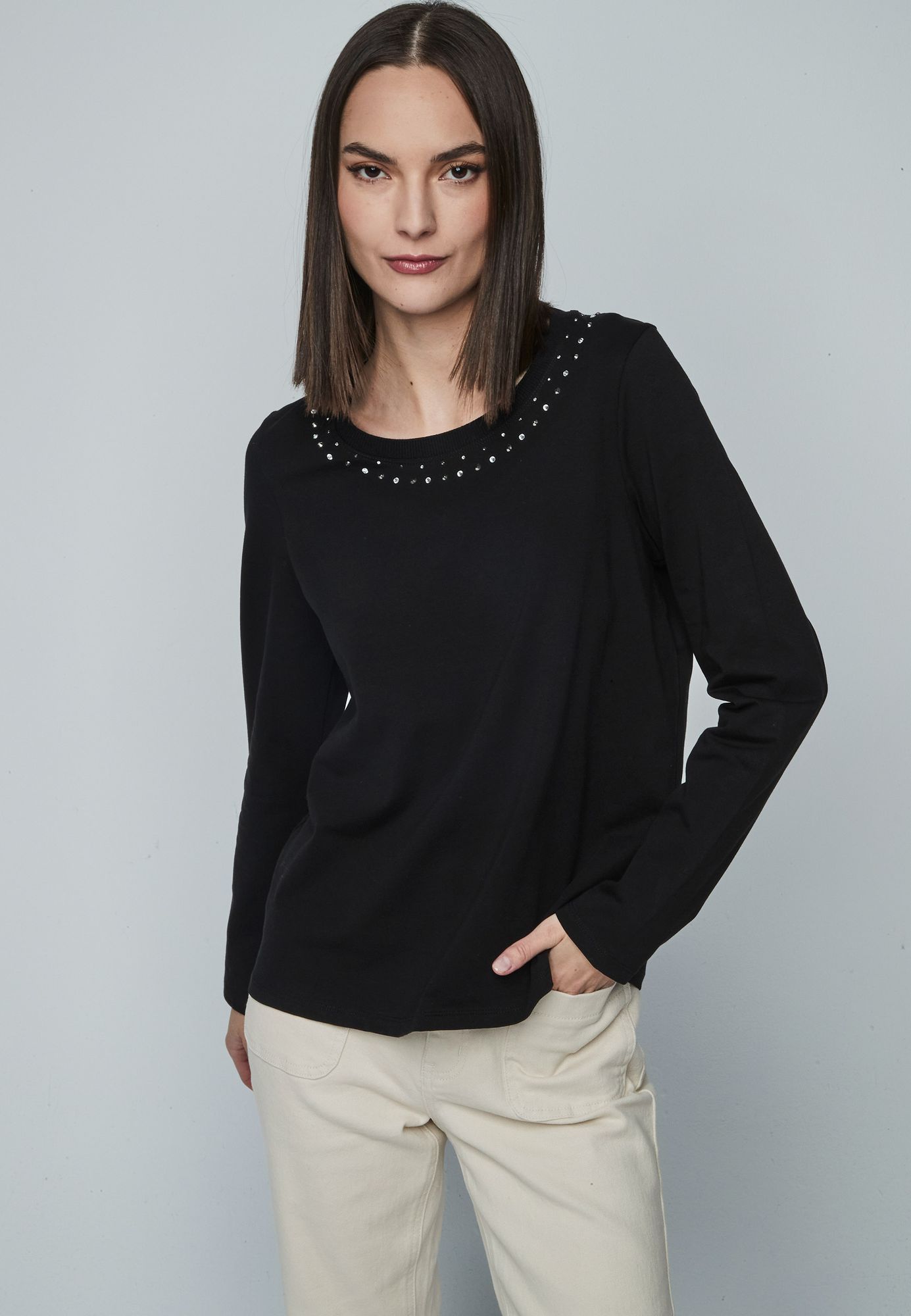 Camiseta de mujer de cuello redondo con tachas y manga larga