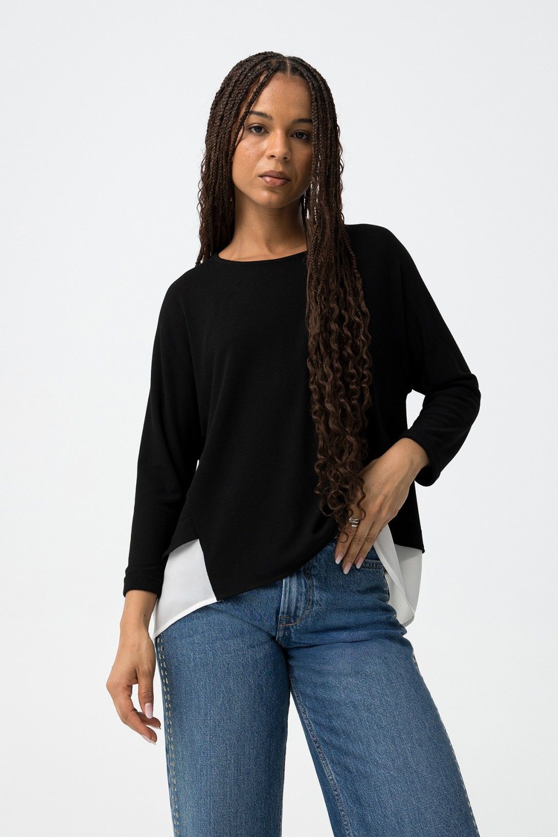 Camisola relaxed fit de punto fino, con dobladillo combinado, cuello redondo y manga corta.
