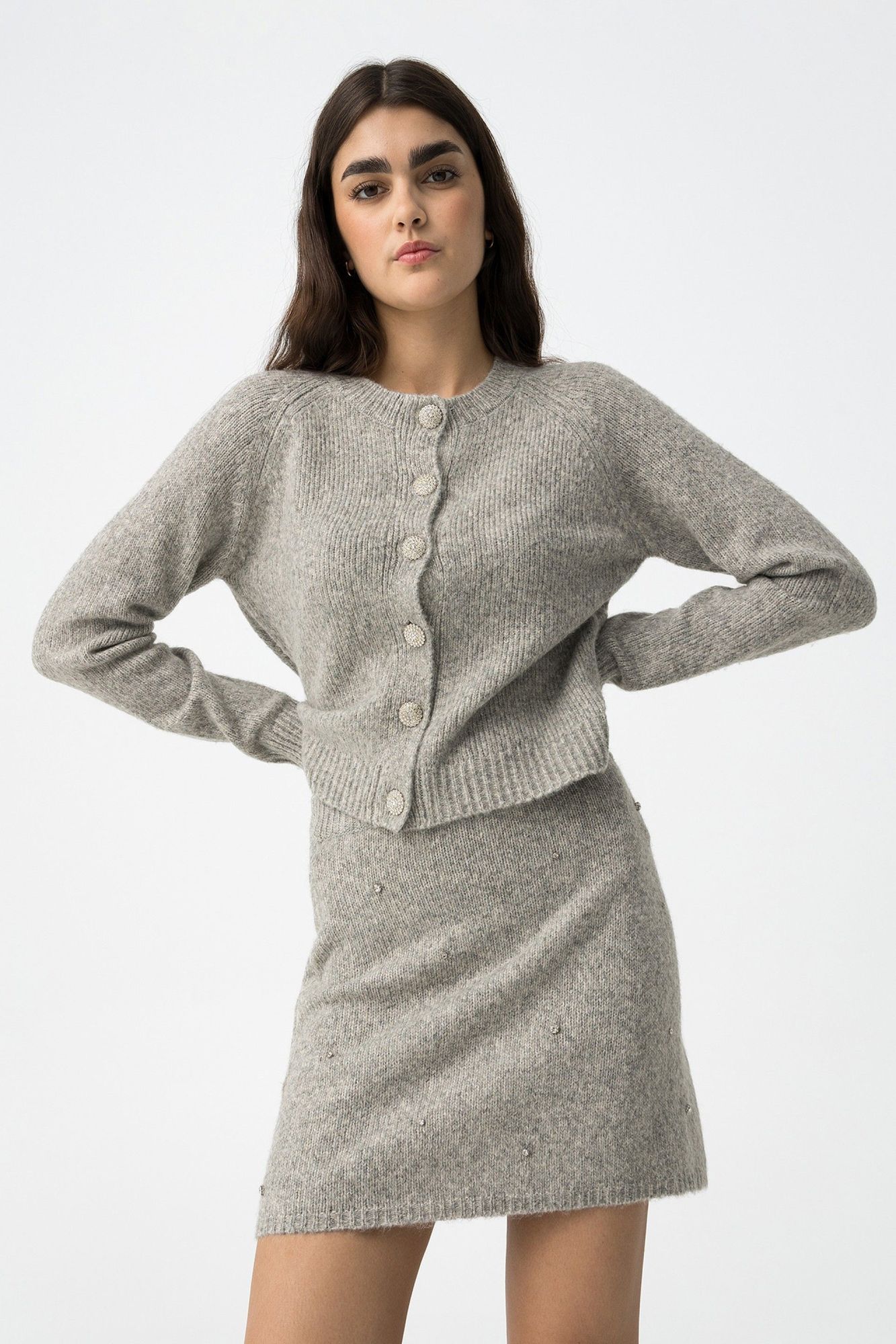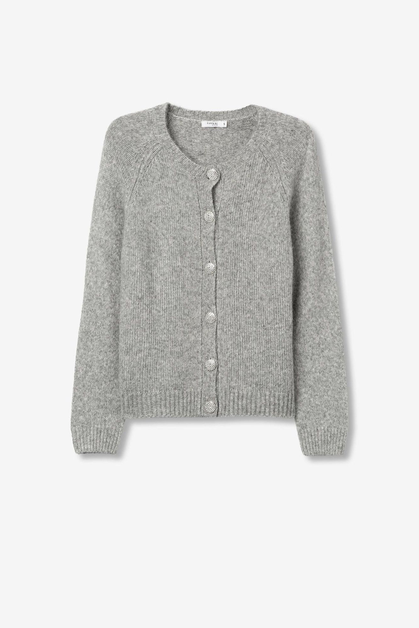 Cárdigan de manga larga con cuello redondo. Cierre frontal de seis botones con piedras decorativas. Punto texturizado de patrón fino. Puños y bajo en rib.