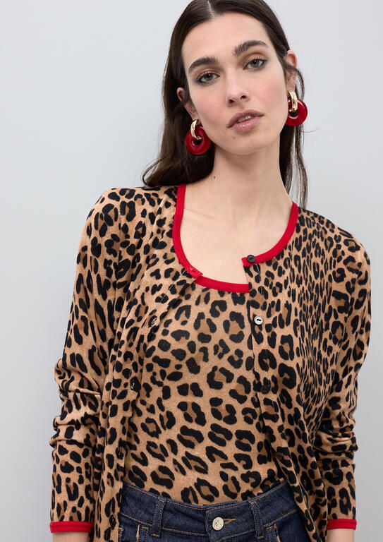 Cardigan de suave tejido con diseño animal print y ribetes en rojo. Manga larga y cierre frontal de botones. Un toque moderno y atrevido para cualquier look de día o de noche.