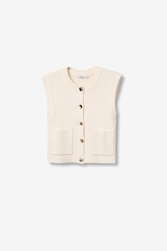Chaleco de punto en color beige con botones dorados y bolsillos frontales. Corte regular sin mangas.