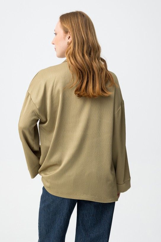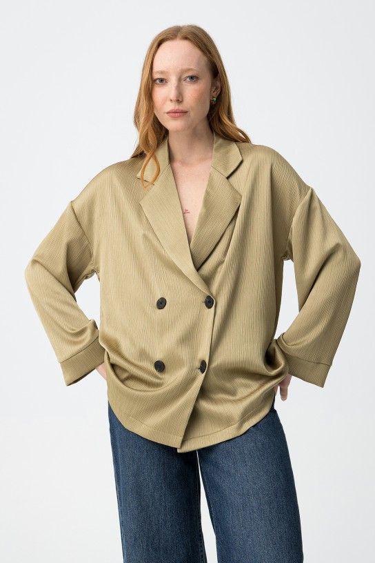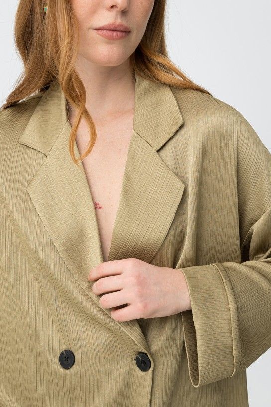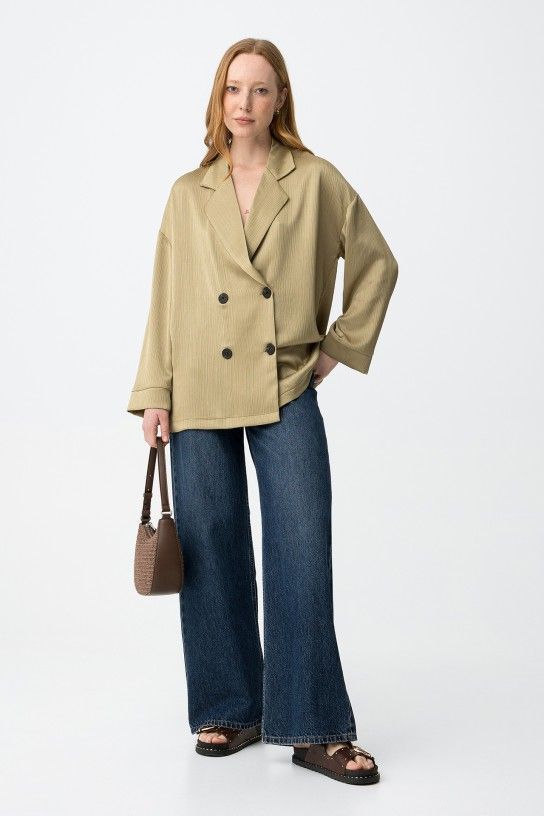 Blazer de color verde claro, corte amplio, doble botonadura, solapas grandes y textura acanalada minimalista.