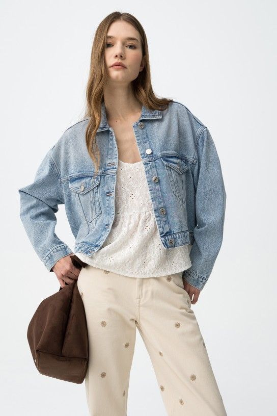 Corte recto, estilo oversize, con bolsillos delanteros y botones metálicos, en azul claro lavado.