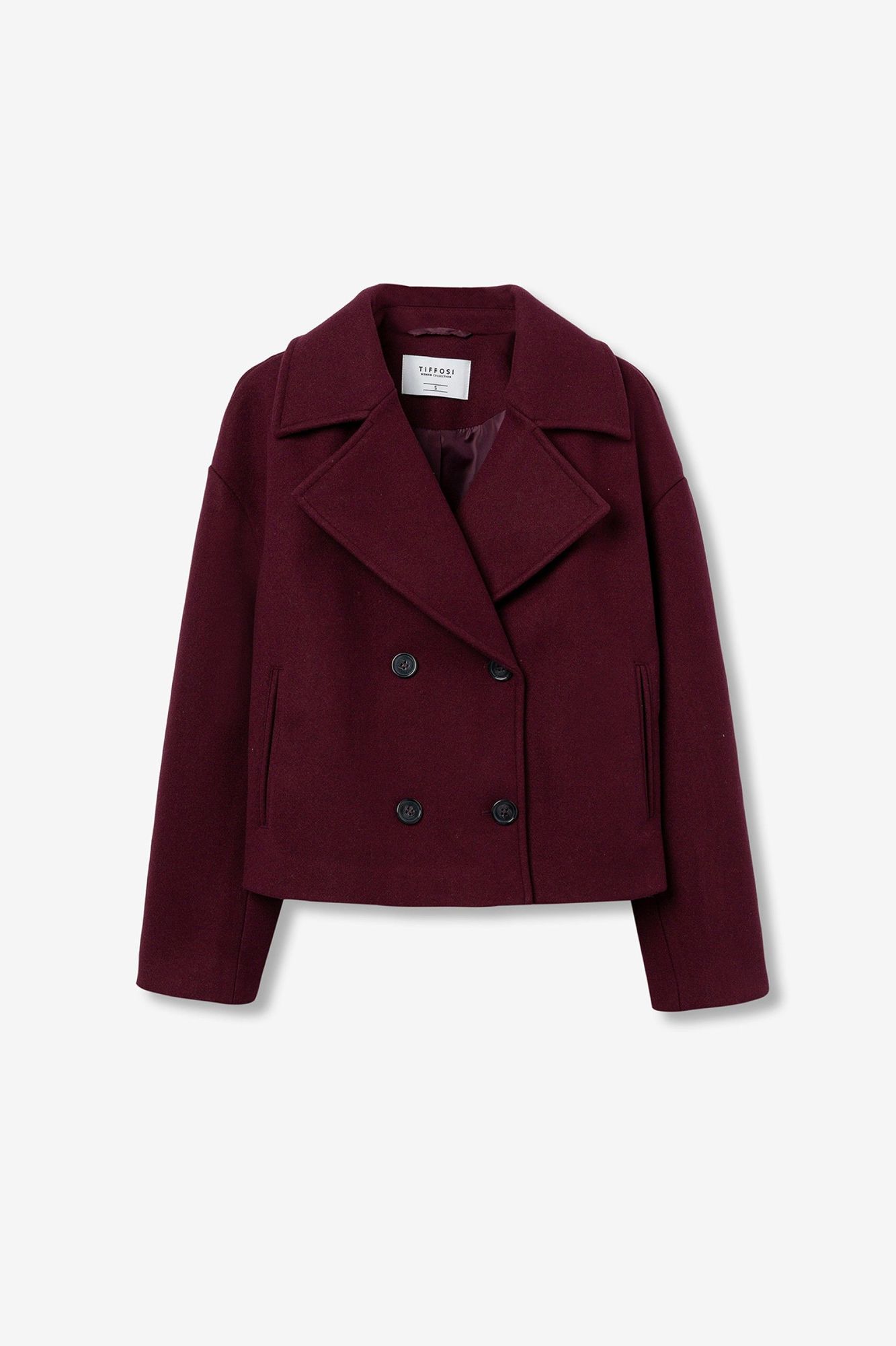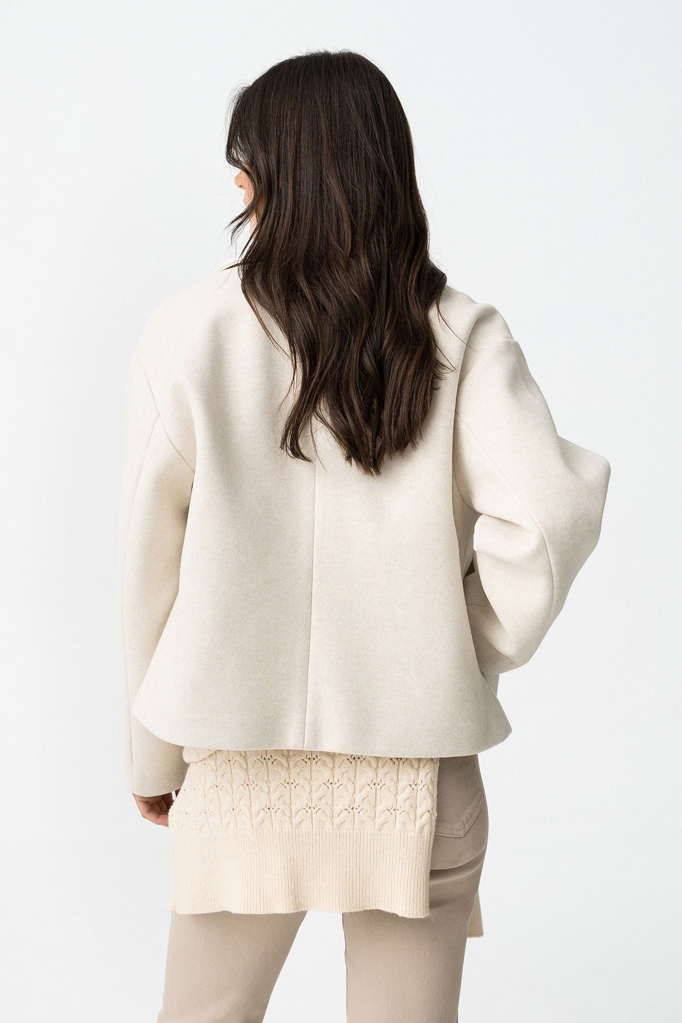 Abrigo corto de corte relaxed con dos bolsillos frontales, cruzado doble y cierre de botón. Solapa tipo notch y manga larga.