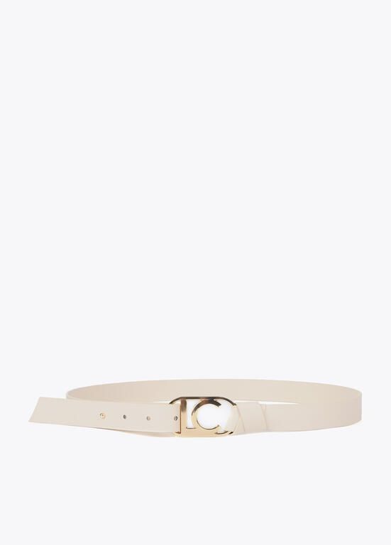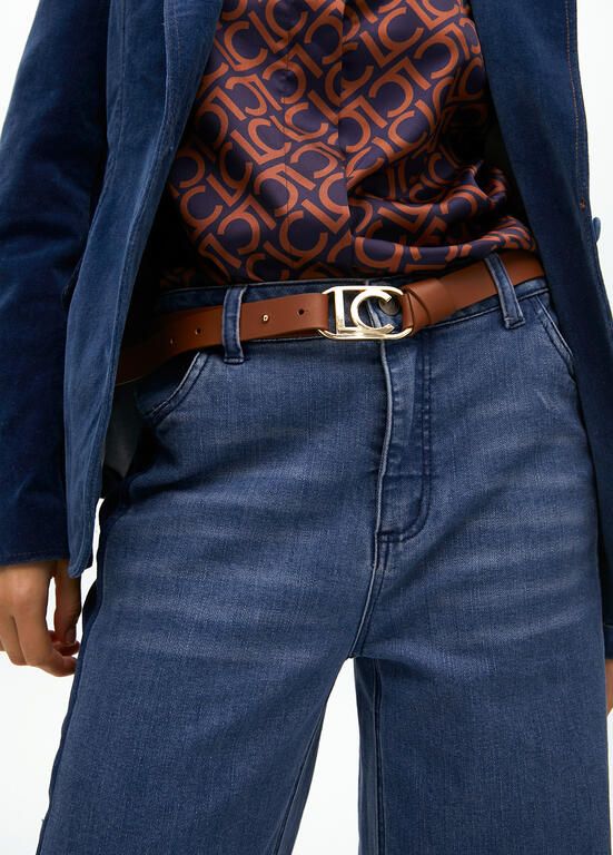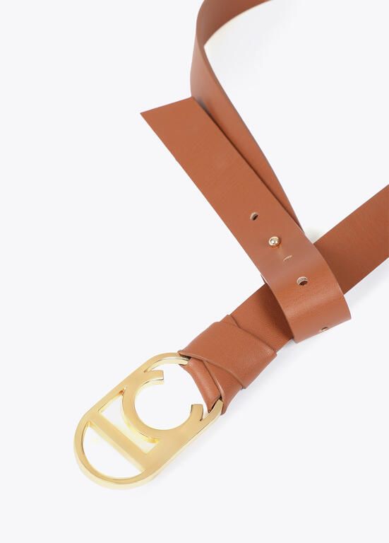 Cinturón elegante en cuero marrón con hebilla ovalada dorada detallando el logo de la marca. Ajustable a varias tallas, ideal para elevar cualquier conjunto con un toque sofisticado.