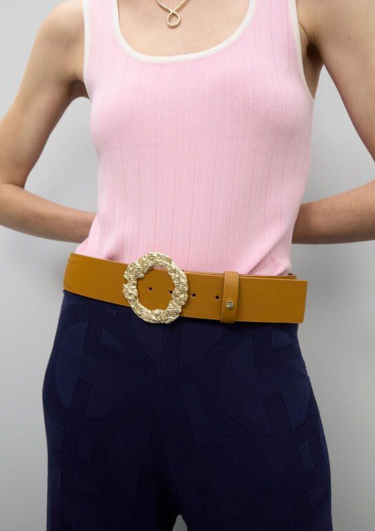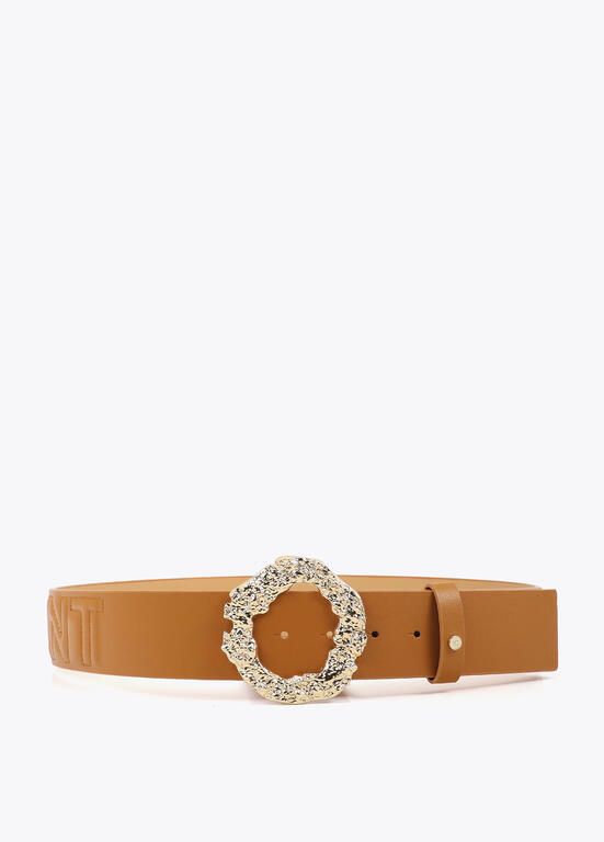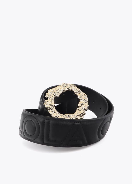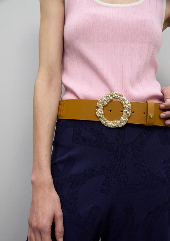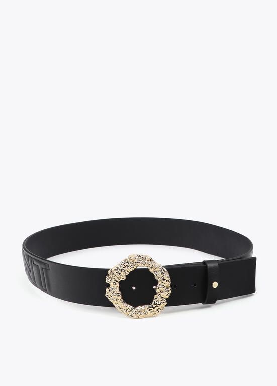 Elegante cinturón con una hebilla irregular labrada y un distintivo logo pespunteado. Perfecto para elevar cualquier atuendo casual o formal.
