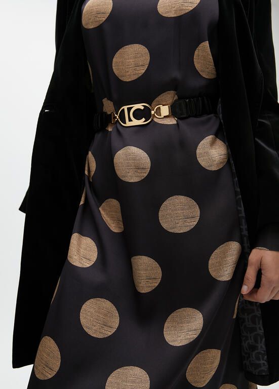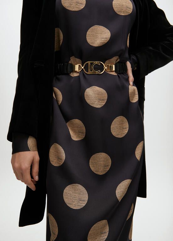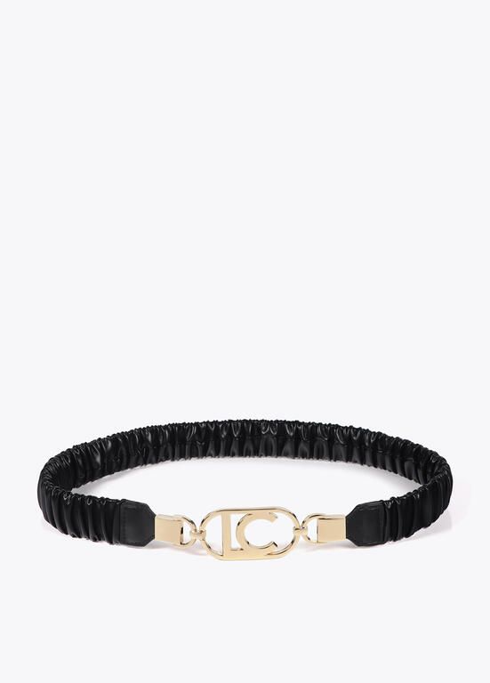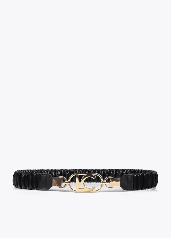 Cinturón elástico negro con efecto piel, rematado con un elegante logo ovalado en tono dorado. Diseño versátil y ajustable para un ajuste perfecto en la cintura. Complemento ideal para realzar cualquier conjunto con un toque moderno y distintivo.
