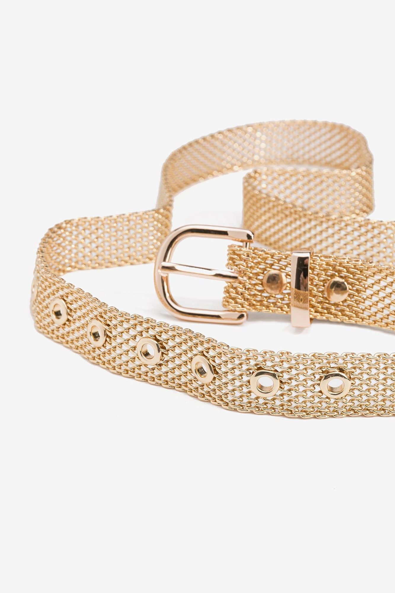 Cinturón metálico de diseño ancho con hebilla dorada. Dispone de 7 agujeros para ajuste.