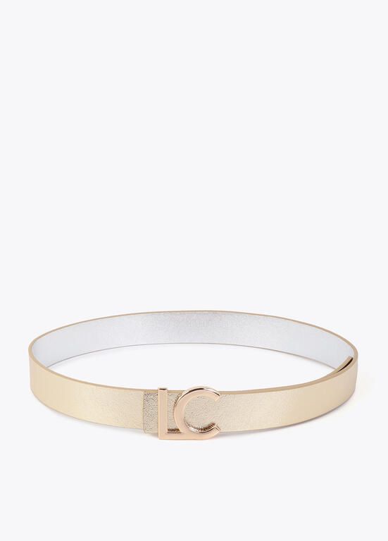Cinturón en efecto piel reversible, colores dorado y plateado con letras logo doradas a modo de hebilla.