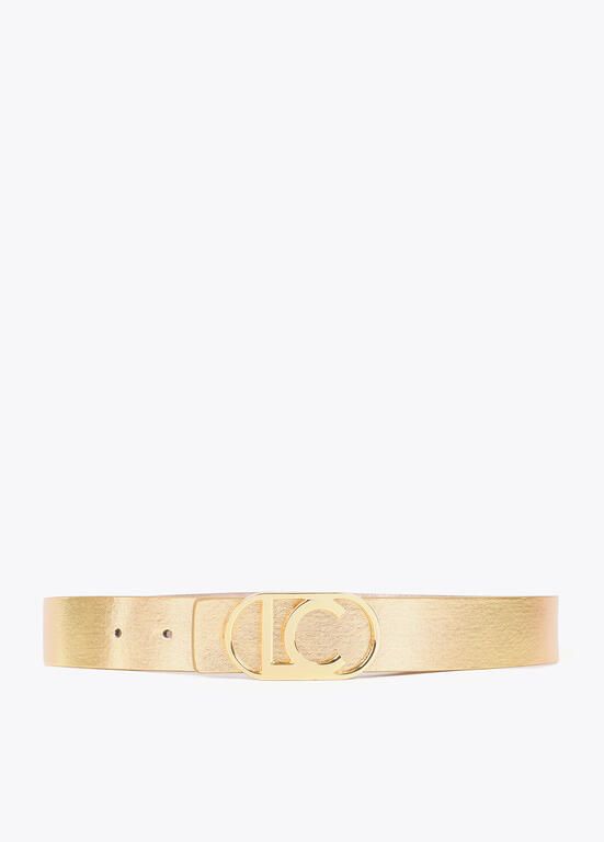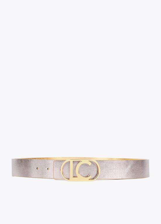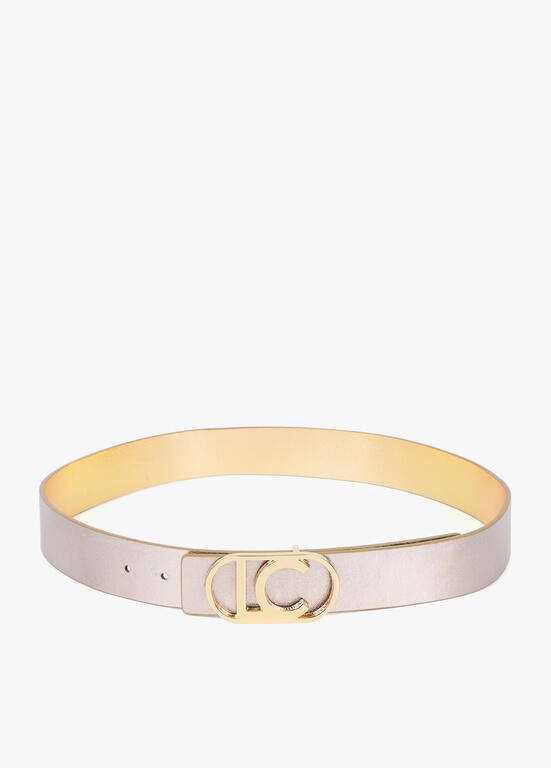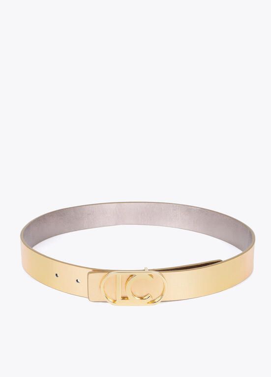 Cinturón elegante y versátil, reversible en tonos metálicos. Presenta una hebilla ovalada dorada con el logotipo característico de la marca. Fabricado en materiales de alta calidad para garantizar durabilidad. Perfecto para dar un toque sofisticado a cualquier conjunto.