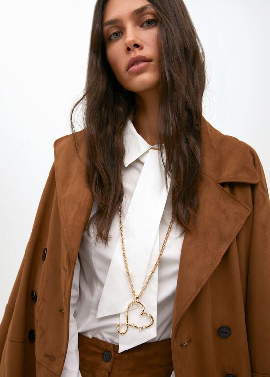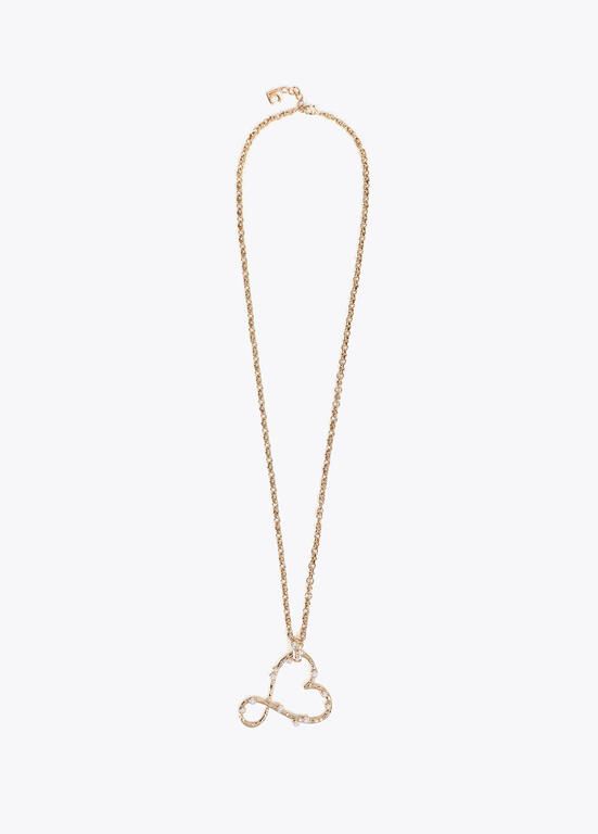 Elegante collar con cadena fina y colgante de corazón entrelazado con infinito. Acabado en dorado brillante y detalles de perlas simuladas. Cierre ajustable.