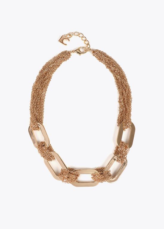 Collar corto con diseño de múltiples cadenitas entrelazadas y eslabones dorados. Acabado en un cierre de mosquetón ajustable para un ajuste preciso. Ideal para añadir un toque elegante a cualquier atuendo.