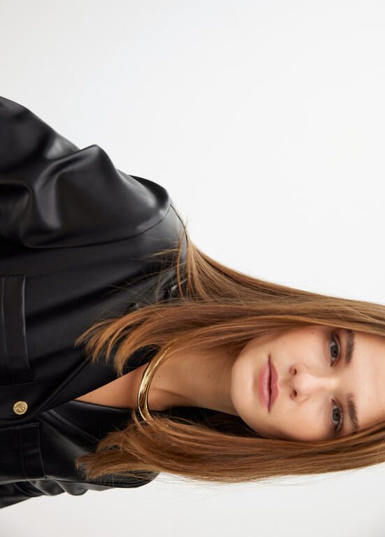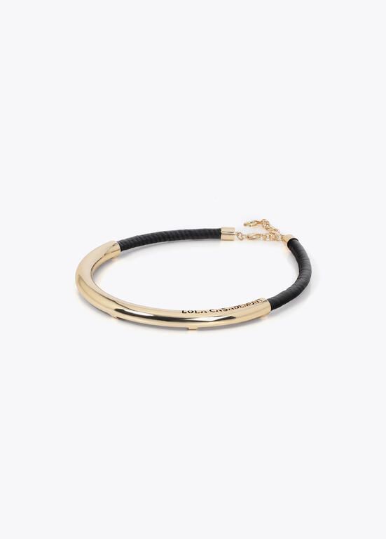 Collar corto con diseño de tubo y acabado en efecto piel. Detalle de logo troquelado en metal dorado. Cierre ajustable para un mejor ajuste al cuello.