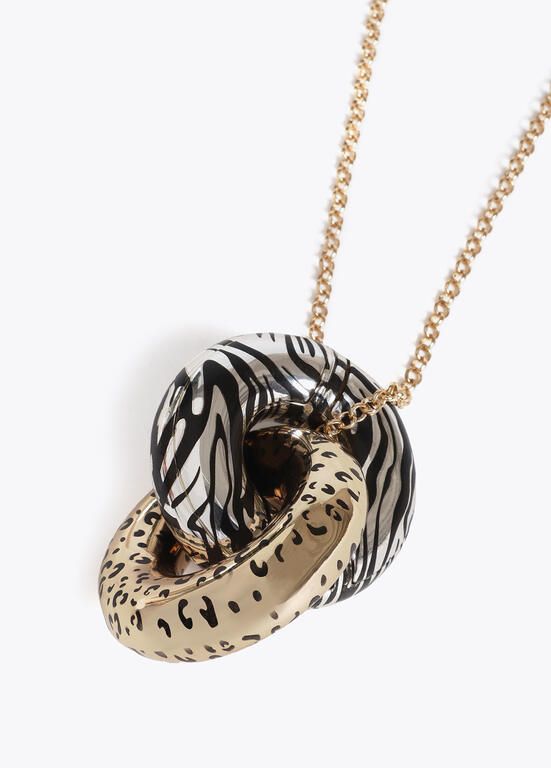 Collar largo con diseño de nudo bicolor y estampado de print animal. Cadena metálica dorada con cierre de mosquetón. Detalle de logotipo en el cierre.