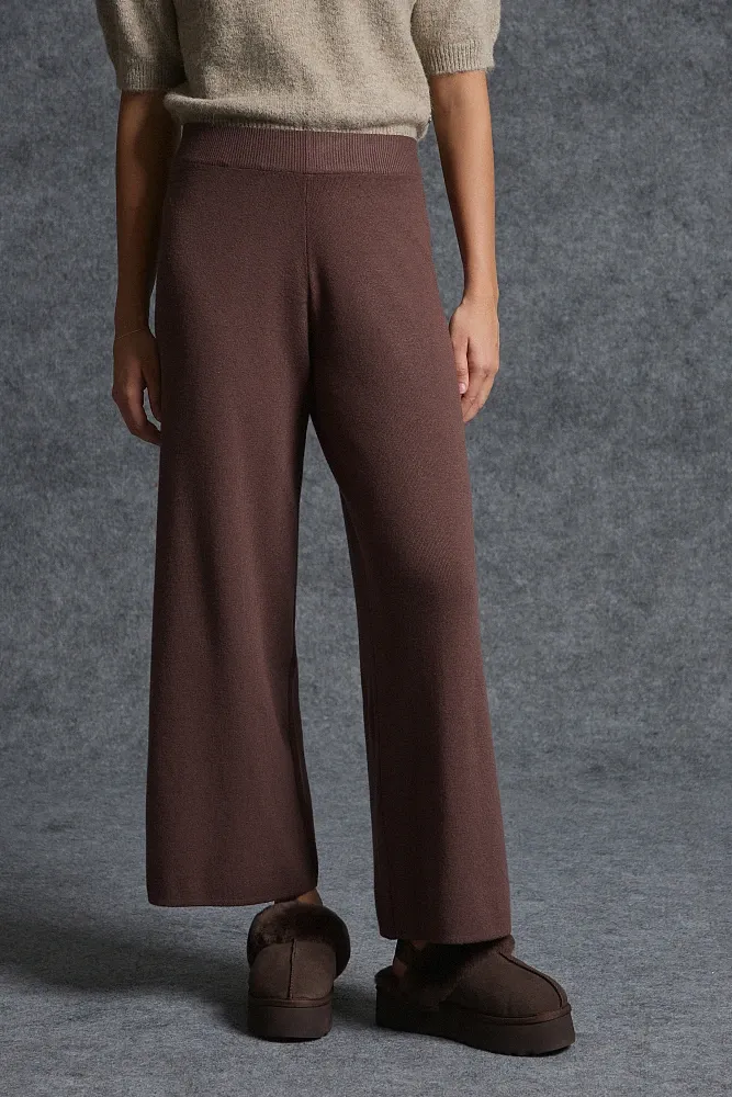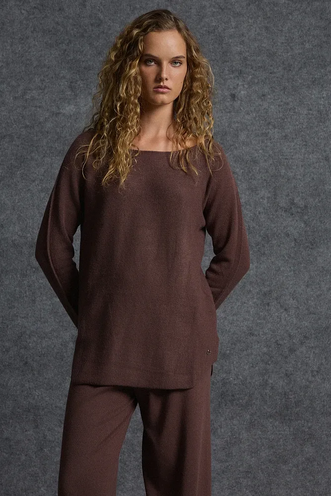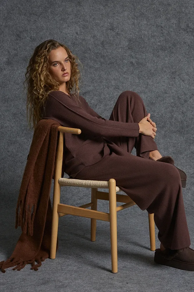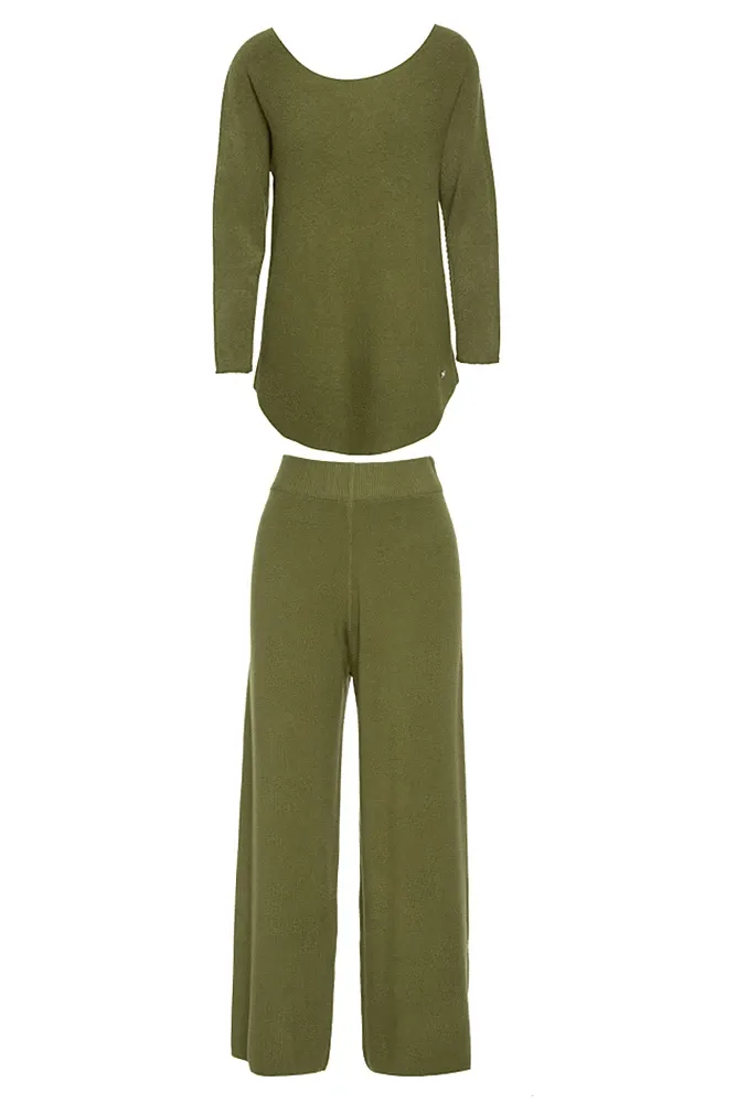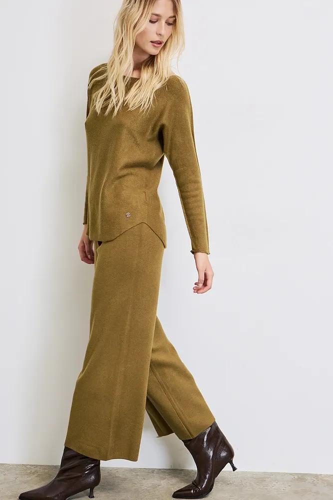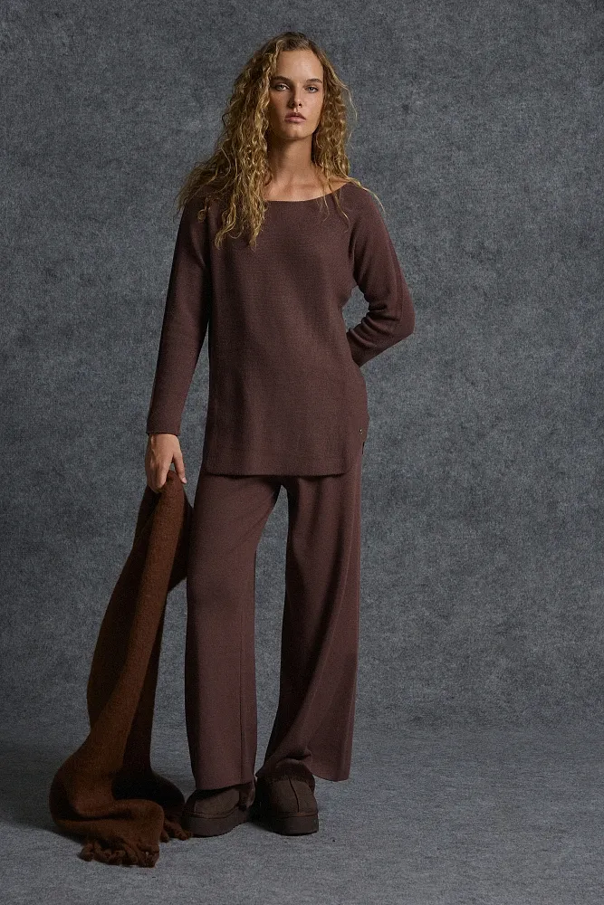 Conjunto de punto, pantalón con cintura elástica, blusa con mangas largas, escote redondo, diseño recto, suave al tacto