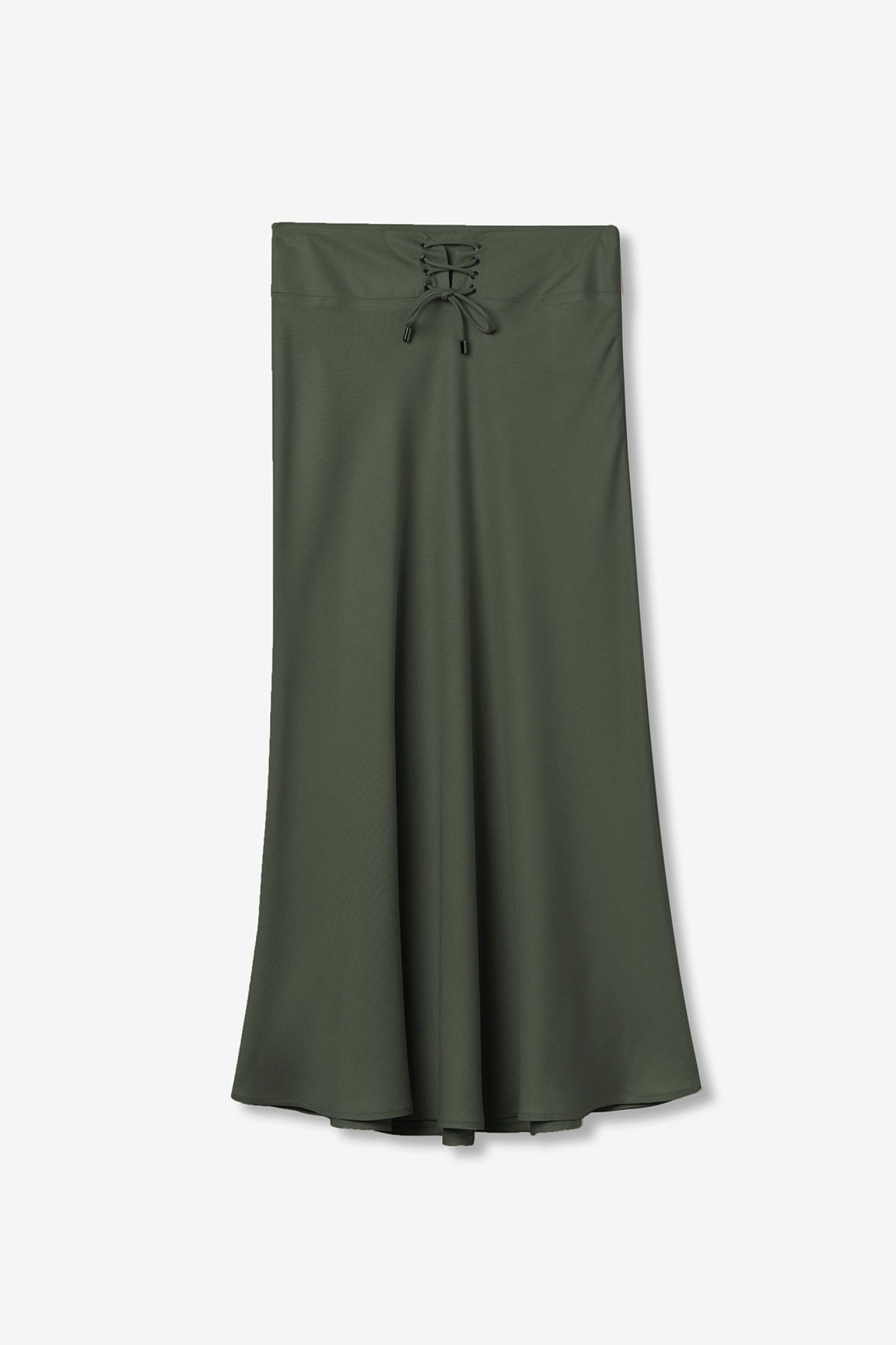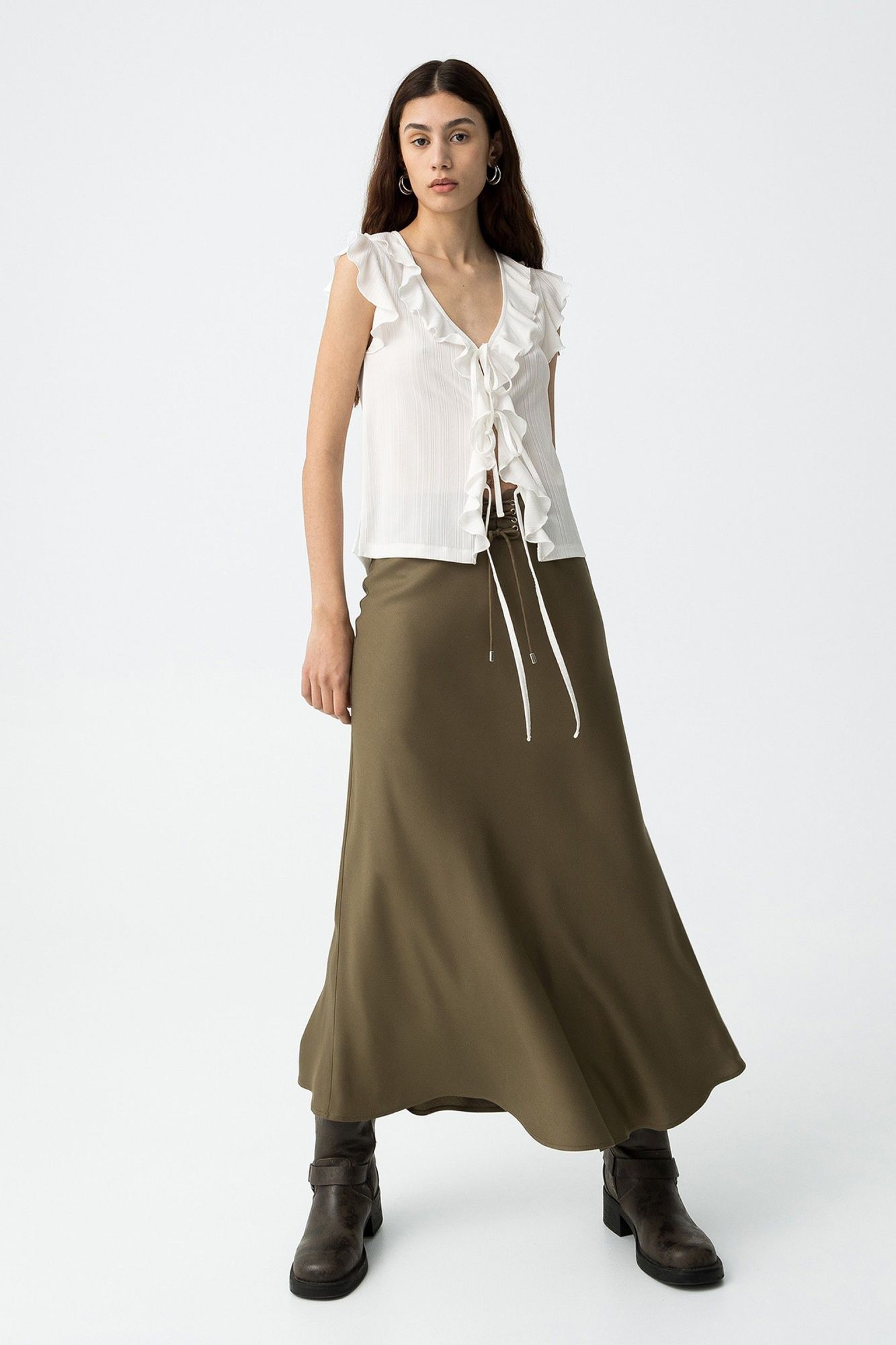 Falda midi con detalle de lazo en la cintura para ajuste.