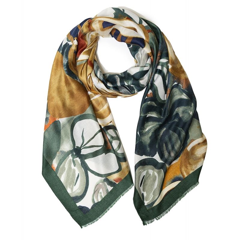 Foulard en tacto suave con fleco en dos lados. con dibujo artístico de hojas. Medidas: 90 x 180 cm. Composición: 100º/ₒ poliéster.